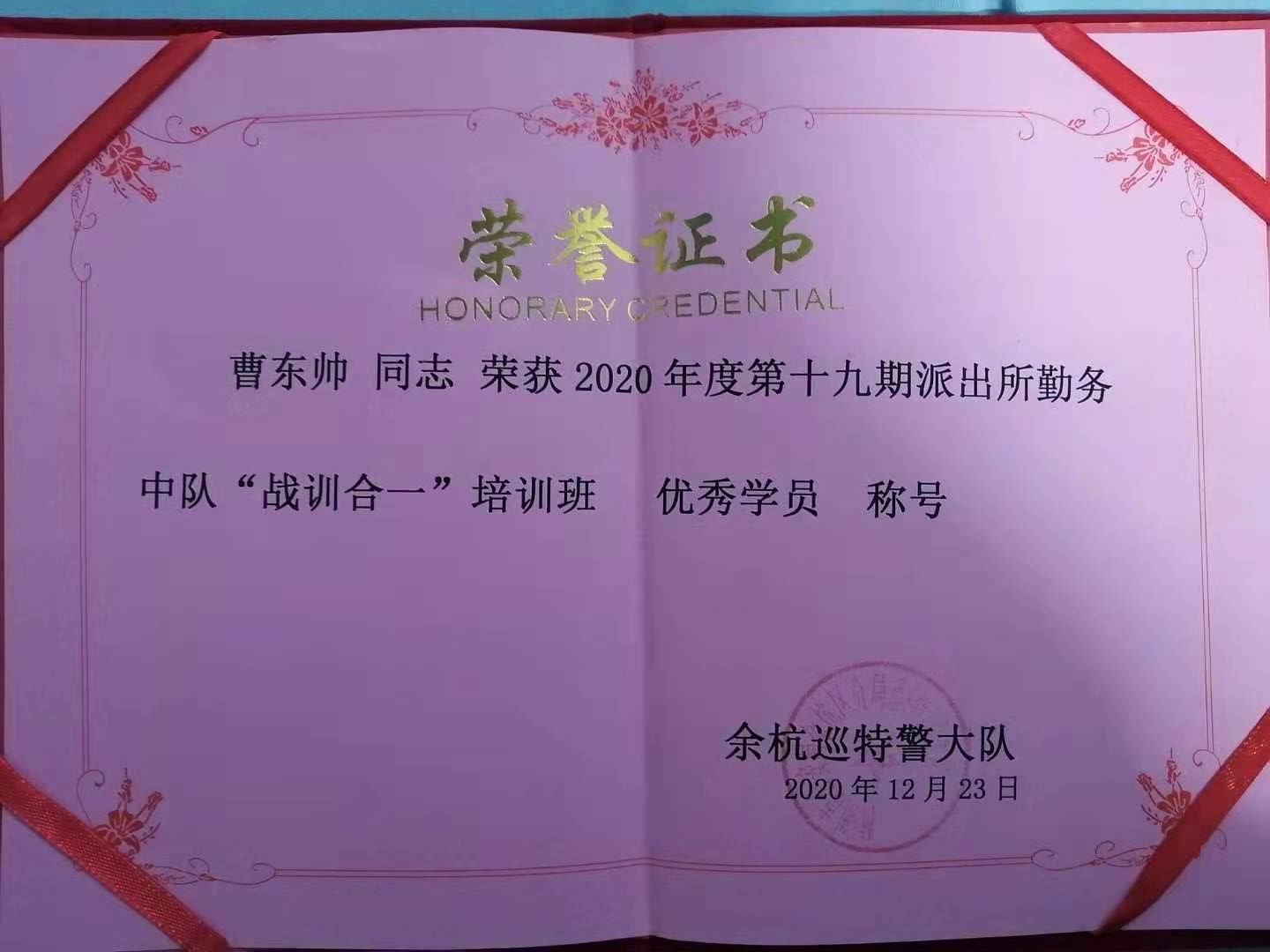 12月23日,浙江民泰駐倉(cāng)前派出所項(xiàng)目隊(duì)員曹東帥在“戰(zhàn)訓(xùn)合一”培訓(xùn)中喜獲佳績(jī)。