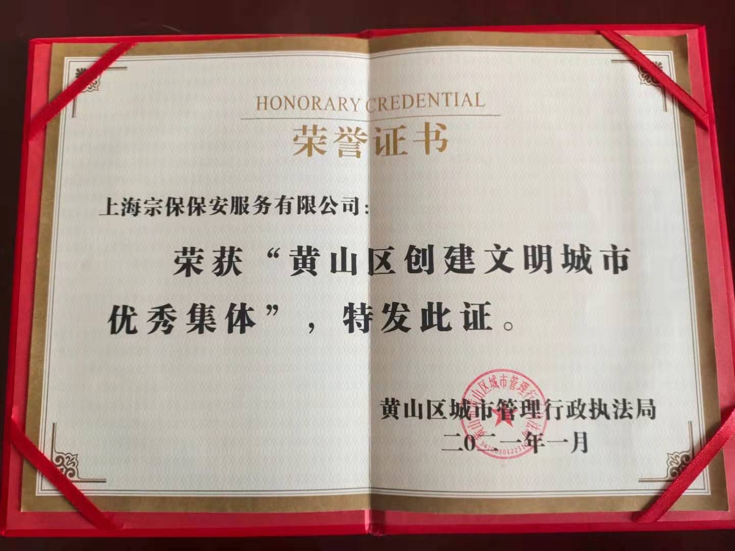 1月11日,黃山區(qū)城市管理行政執(zhí)法局局長汪雷春來到項目基地,為獲評為“黃山區(qū)創(chuàng)建文明城市優(yōu)秀集體”的上海宗保保安服務(wù)有限公司送來獎杯和榮譽證書。