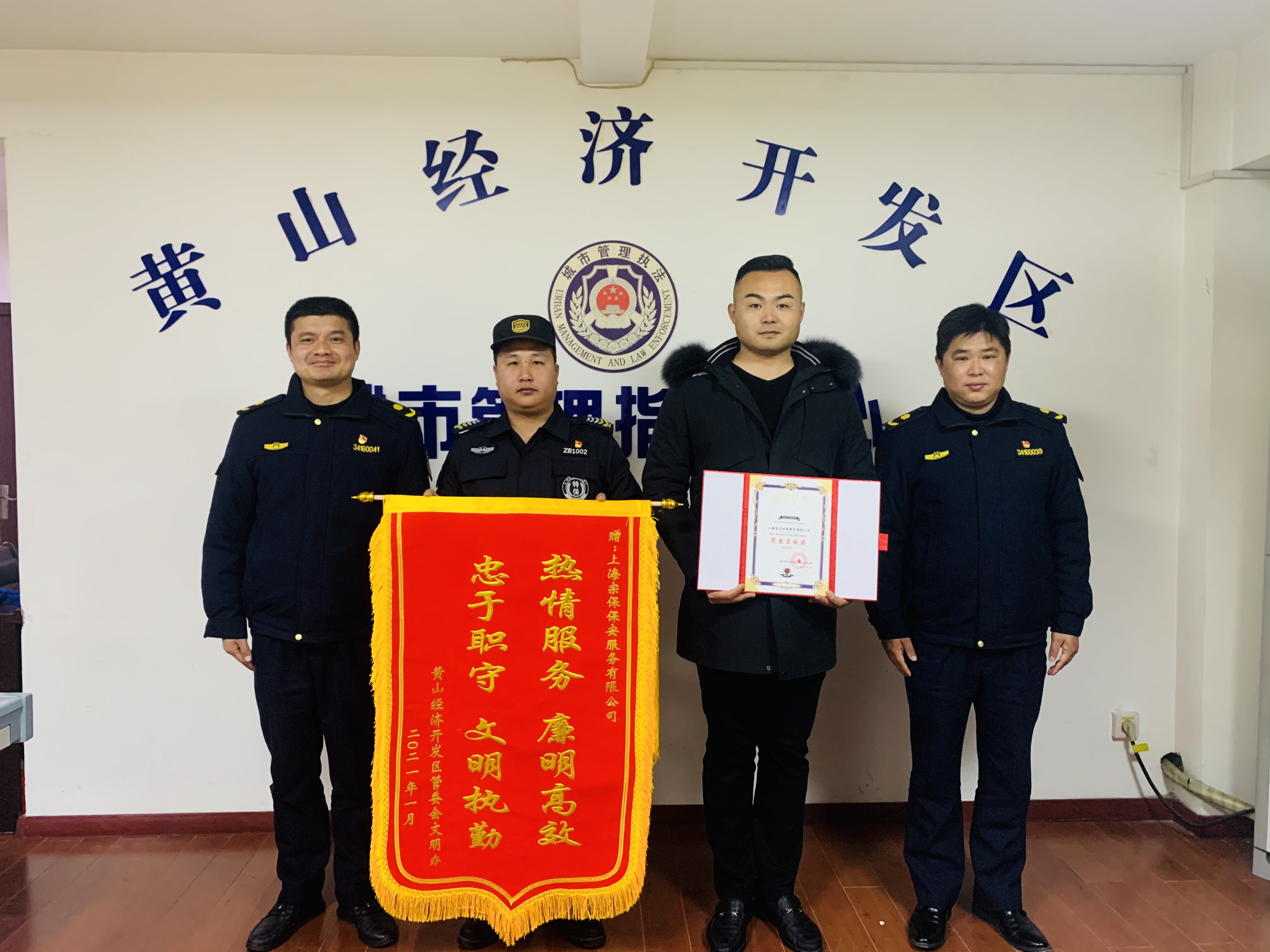 2月2日,黃山高新區(qū)城市管理行政執(zhí)法局局長劉崗、執(zhí)法大隊(duì)大隊(duì)長汪振為獲評黃山高新區(qū)“創(chuàng)建文明城市突出貢獻(xiàn)獎(jiǎng)”的上海宗保保安服務(wù)有限公司頒發(fā)證書,贈(zèng)送錦旗。