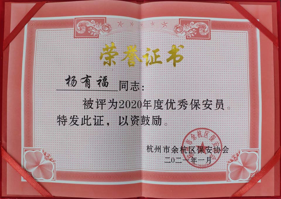 浙江民泰公司被評(píng)為2020年度優(yōu)秀保安服務(wù)公司,保安員楊有福、高樹森被評(píng)為2020年度優(yōu)秀保安員,布超杰被評(píng)為余杭區(qū)治保先進(jìn)個(gè)人。