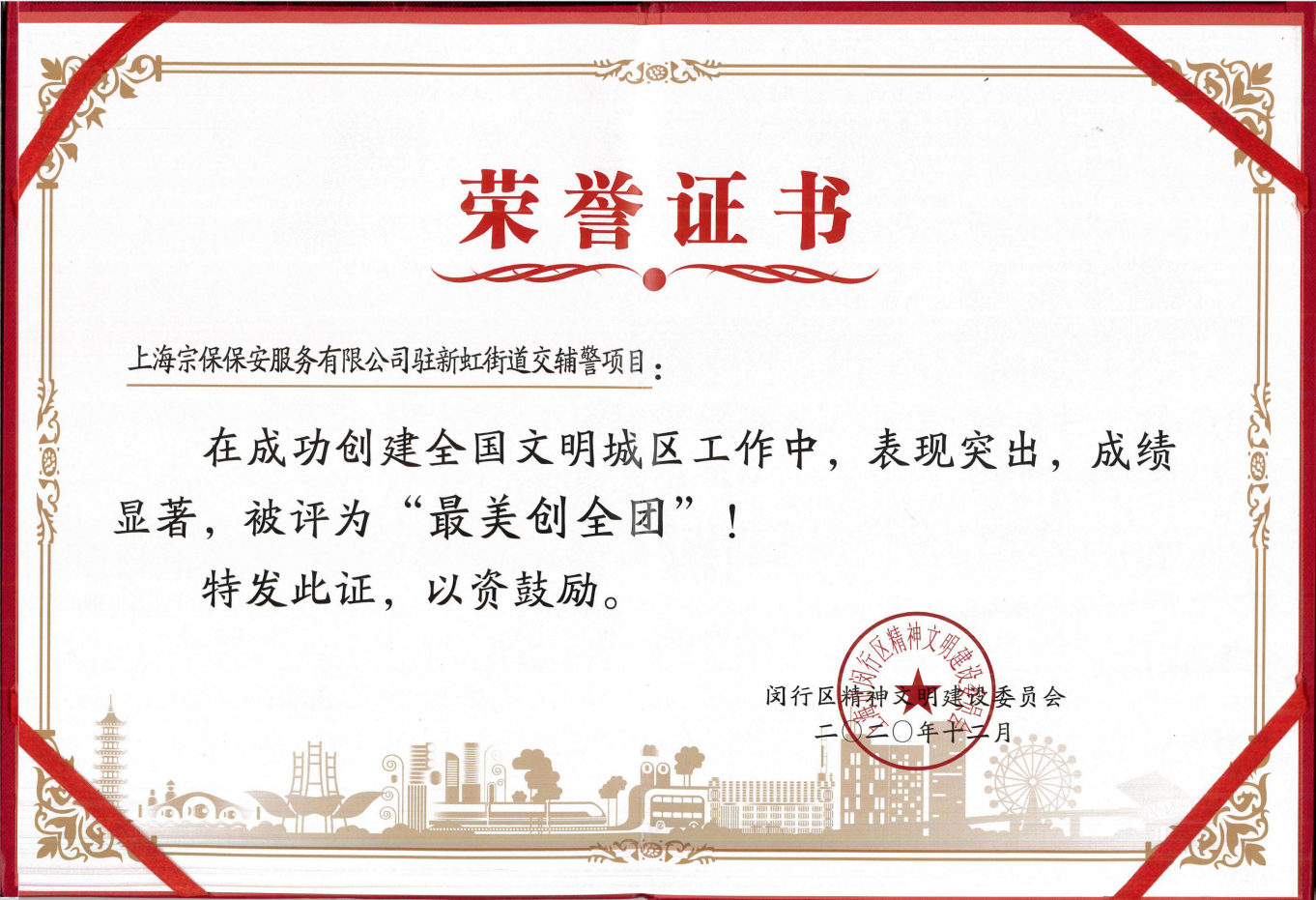 1月7日,閔行區(qū)召開鞏固提升全國(guó)文明城區(qū)建設(shè)工作大會(huì),宗保公司駐新虹街道交管輔警項(xiàng)目表現(xiàn)突出,被評(píng)為“最美創(chuàng)全團(tuán)”。