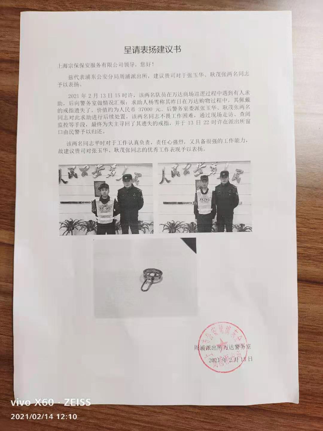 2月13日,公司收到周浦派出所萬達(dá)警務(wù)室送來的表揚建議書,建議表揚公司駐周浦輔警項目隊員張玉華、耿茂張。