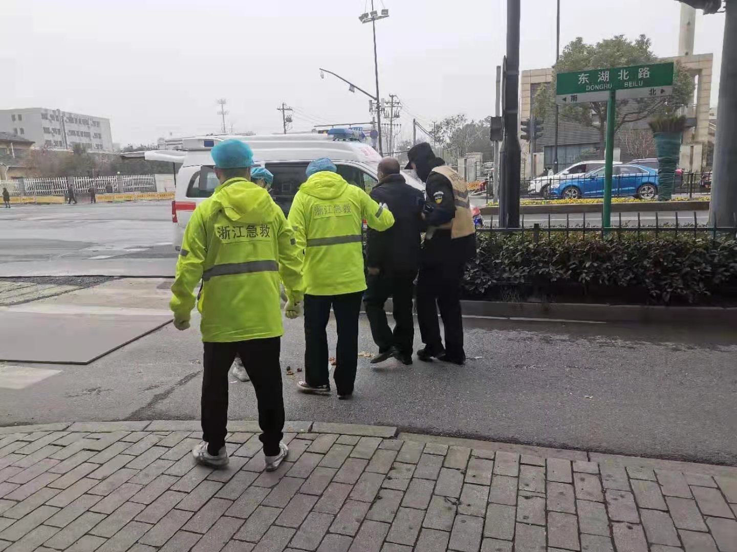 1月24日,浙江民泰駐東湖市容項目隊員沈明銳、魯福龍救助摔傷老人。