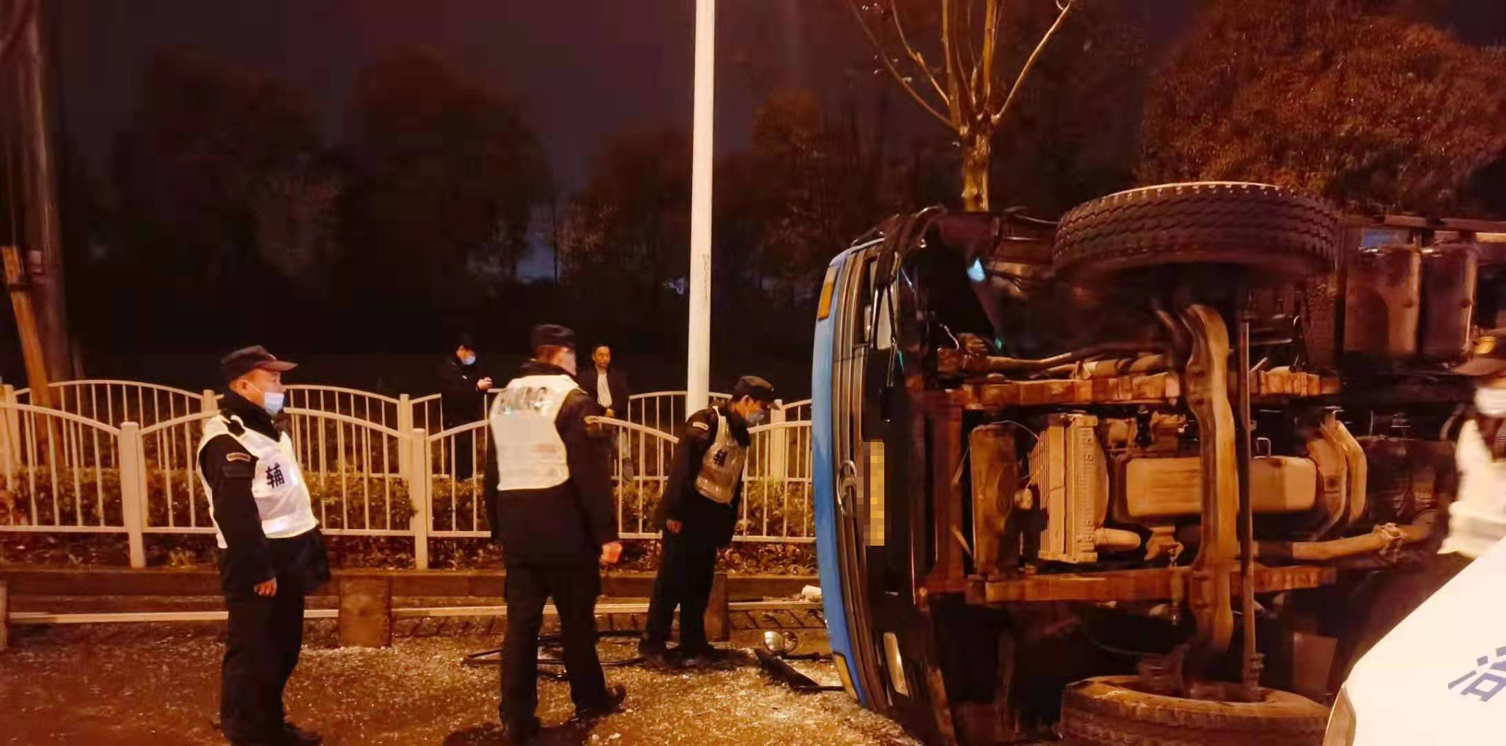 當(dāng)天凌晨1:00左右,金橋派出所值班室接到路人報(bào)警,稱在申江路云順路有一輛拉滿渣土的貨車因?yàn)橛晏炻坊囁龠^快發(fā)生了側(cè)翻。