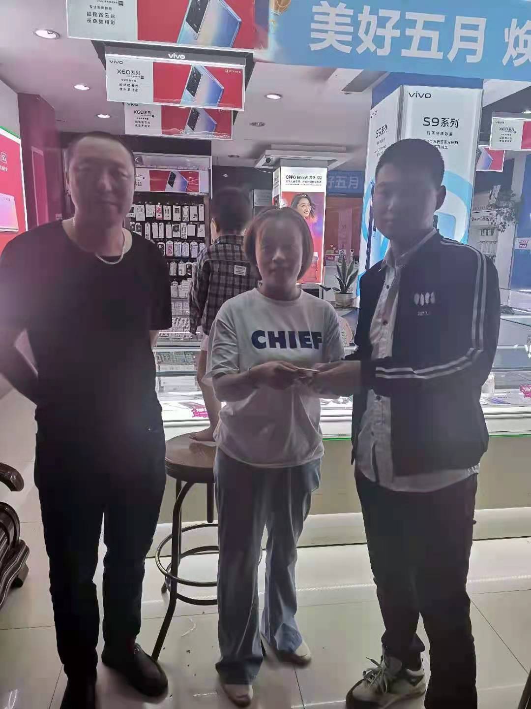 30多分鐘過去了,仍未見失主前來尋找。正當兩人準備將手機交到派出所時,一女子打來電話說自己是失主,是附近vivo手機店的店主,但因店里無人看店,暫時無法走開。得知這一情況,兩人便主動提出可以將手機送過去。