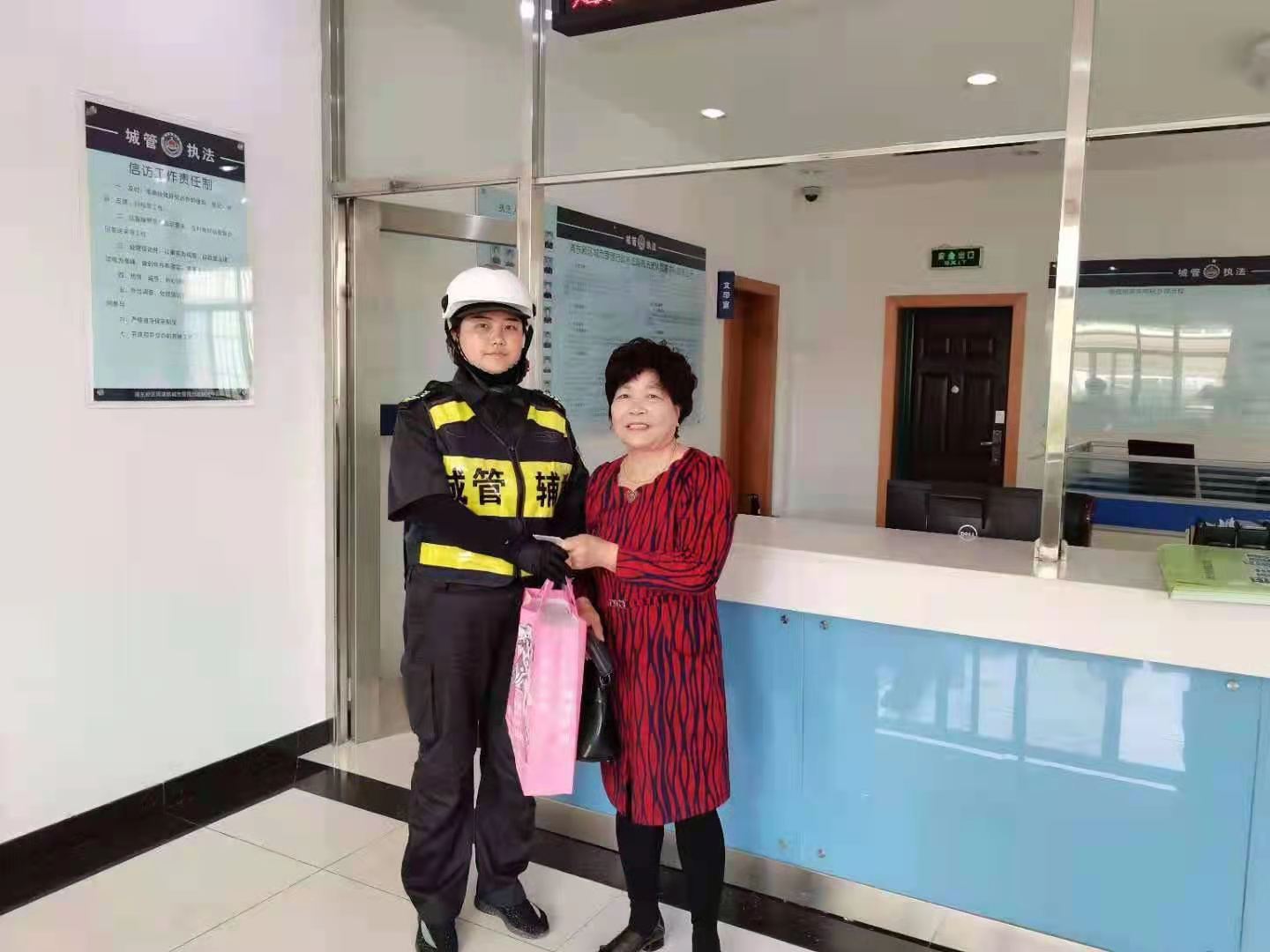16:05左右,一位阿姨急匆匆趕來,好像是在尋找什么。曹秋霞見狀,主動上前詢問是不是丟了東西,阿姨說自己丟了一個手提袋,描述的袋內(nèi)裝的東西和她撿到的東西一模一樣。確認阿姨是失主后,曹秋霞將阿姨帶到周浦城管中隊,把手提袋歸還給了阿姨。