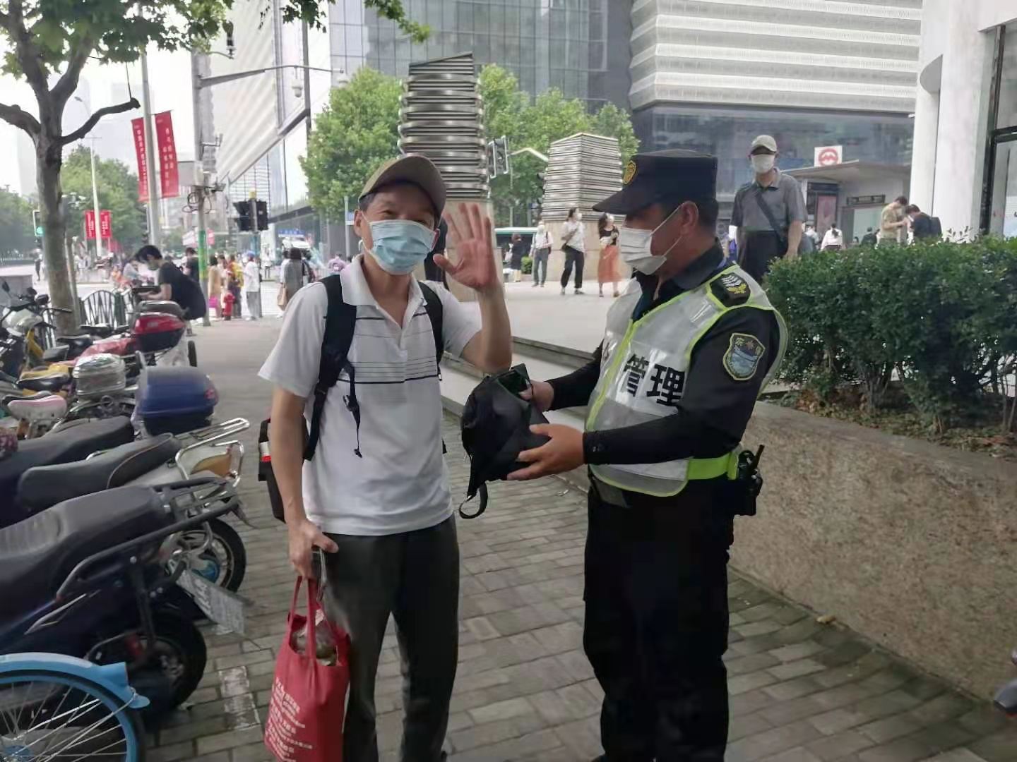 當(dāng)天8:15,漆貴成在商城路地鐵3號口附近整理共享單車時,發(fā)現(xiàn)一個挎包被人遺忘在車筐里,便立即上報班組長并按指示在原地等待失主。