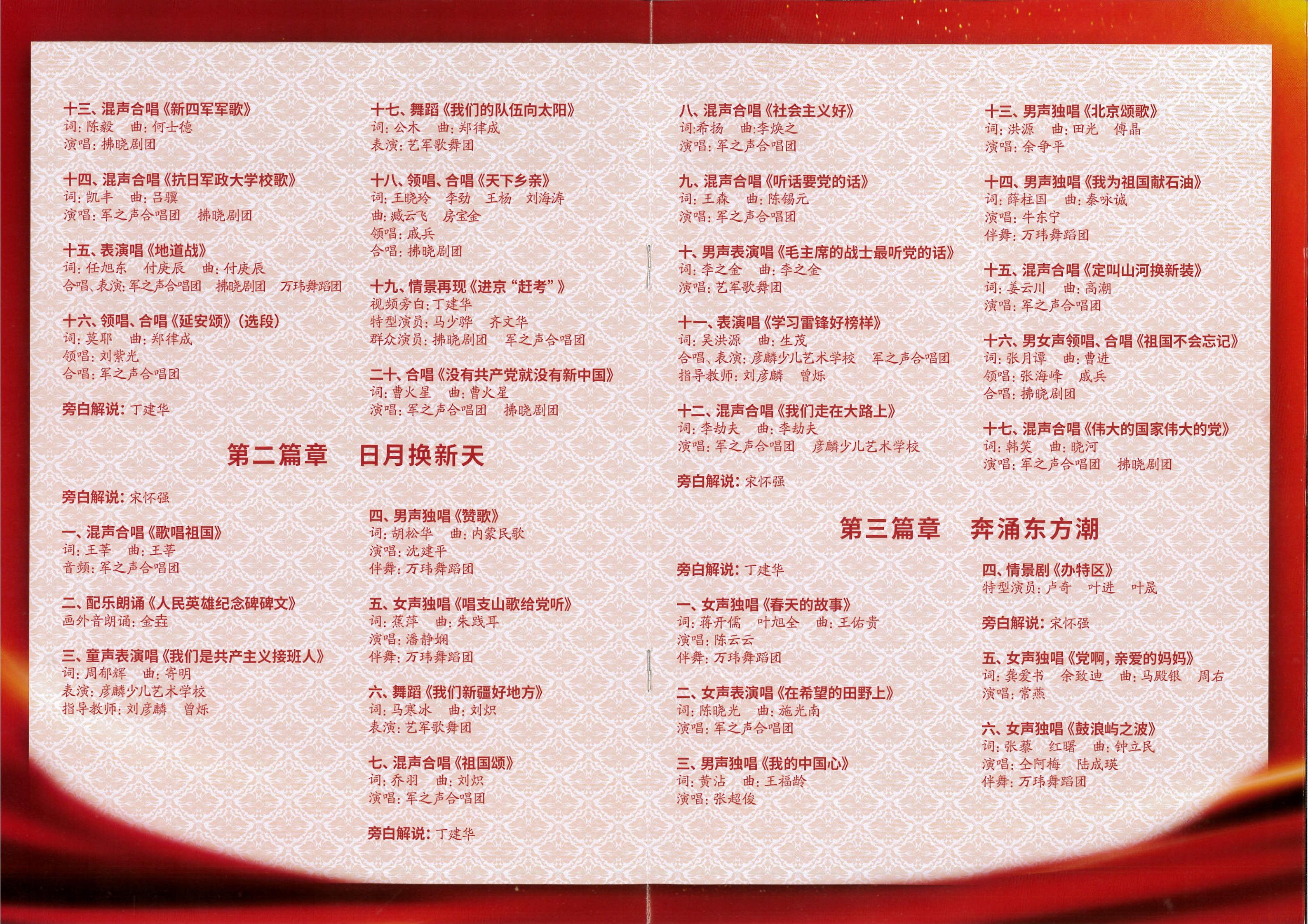 演出從6月8日開始至6月10日結(jié)束,包含四個篇章:“崢嶸歲月稠”“日月?lián)Q新天”“奔涌東方潮”“奮進(jìn)新時代”,分別反映了黨在新民主主義革命、社會主義革命和建設(shè)時期,改革開放和中國特色社會主義進(jìn)入新時代這四個階段,團(tuán)結(jié)帶領(lǐng)中國人民不斷從勝利走向勝利的光輝歷程。