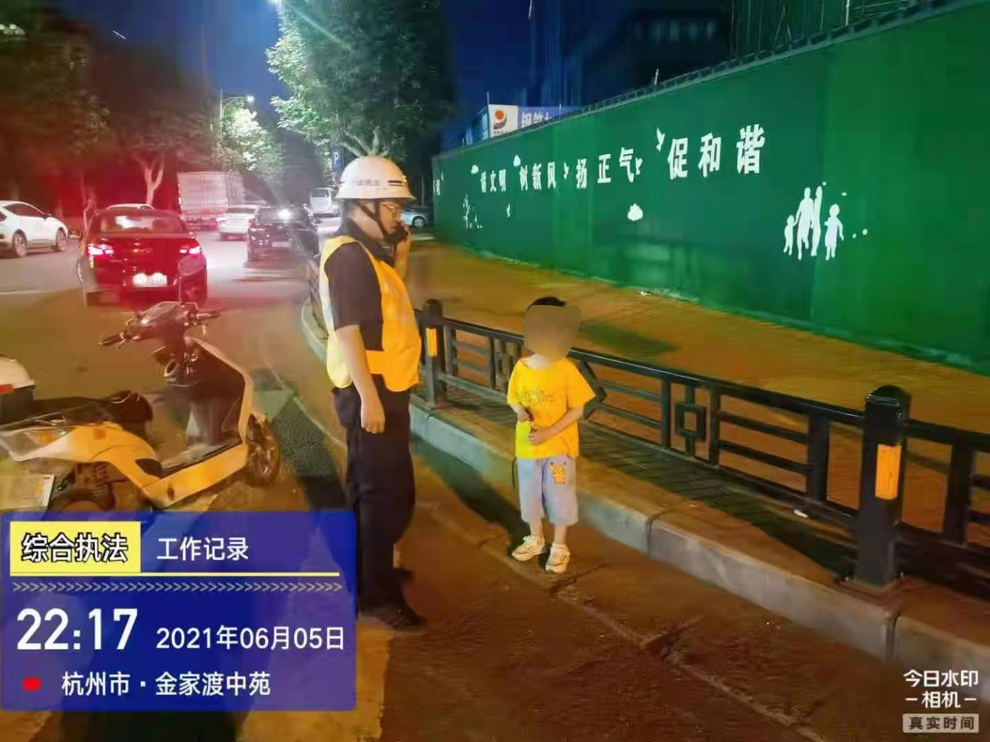 6月5日,浙江民泰駐良渚物流項目隊員孫明峰、李軍軍幫助走散男童找到家人。
