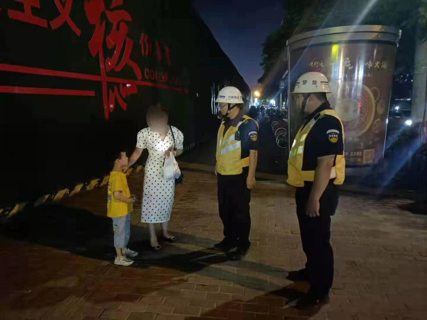 當(dāng)天22:17,孫明峰、李軍軍在金家渡路巡邏時,發(fā)現(xiàn)一個小男孩站在馬路邊手足無措,神情慌張,旁邊沒有大人陪伴,過往車輛很多,十分危險。