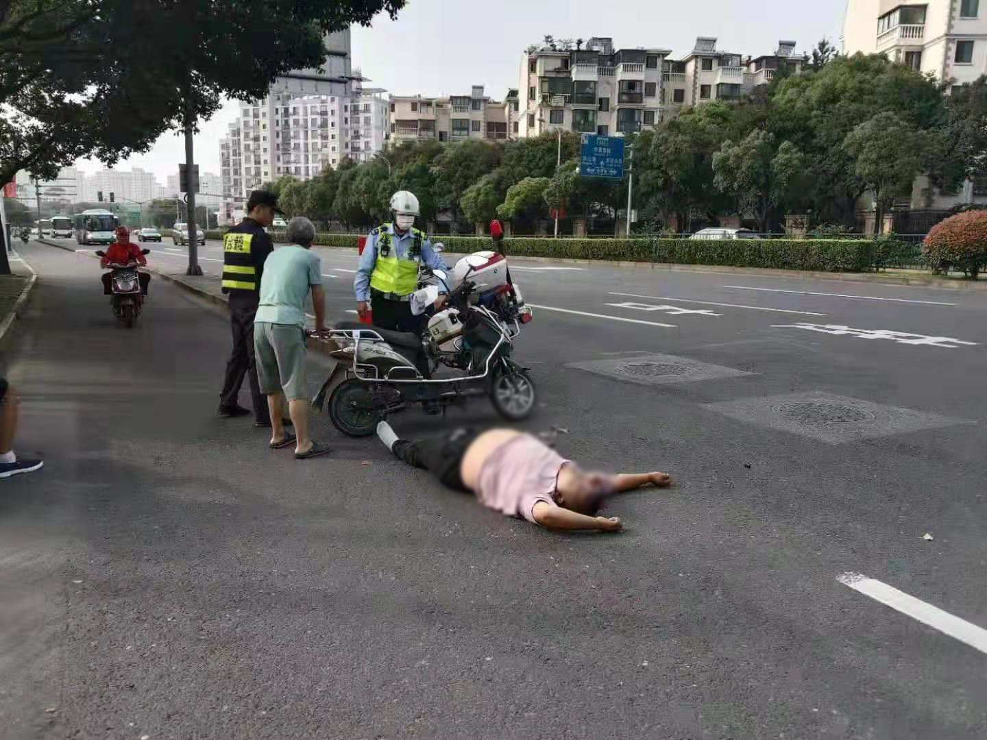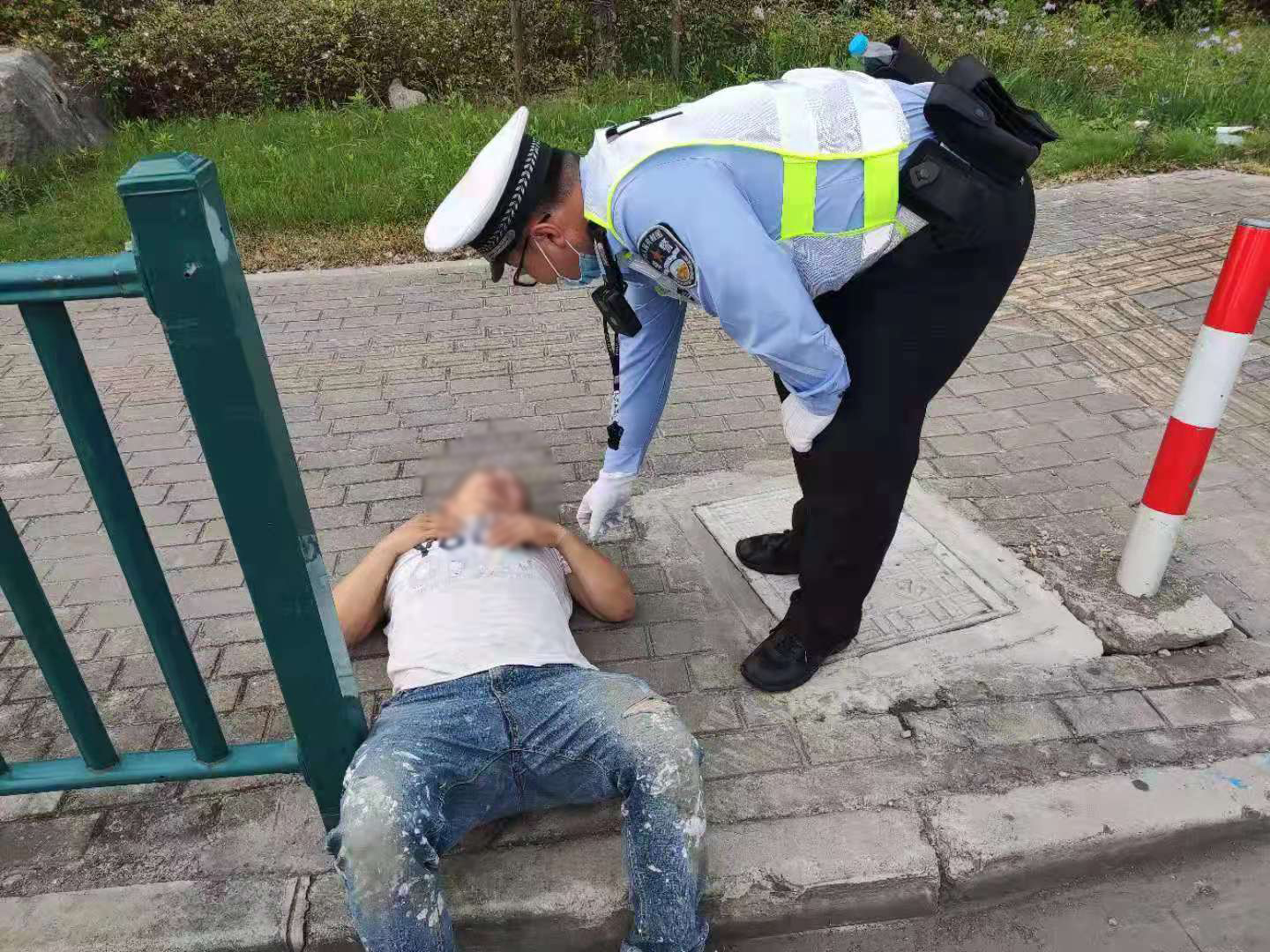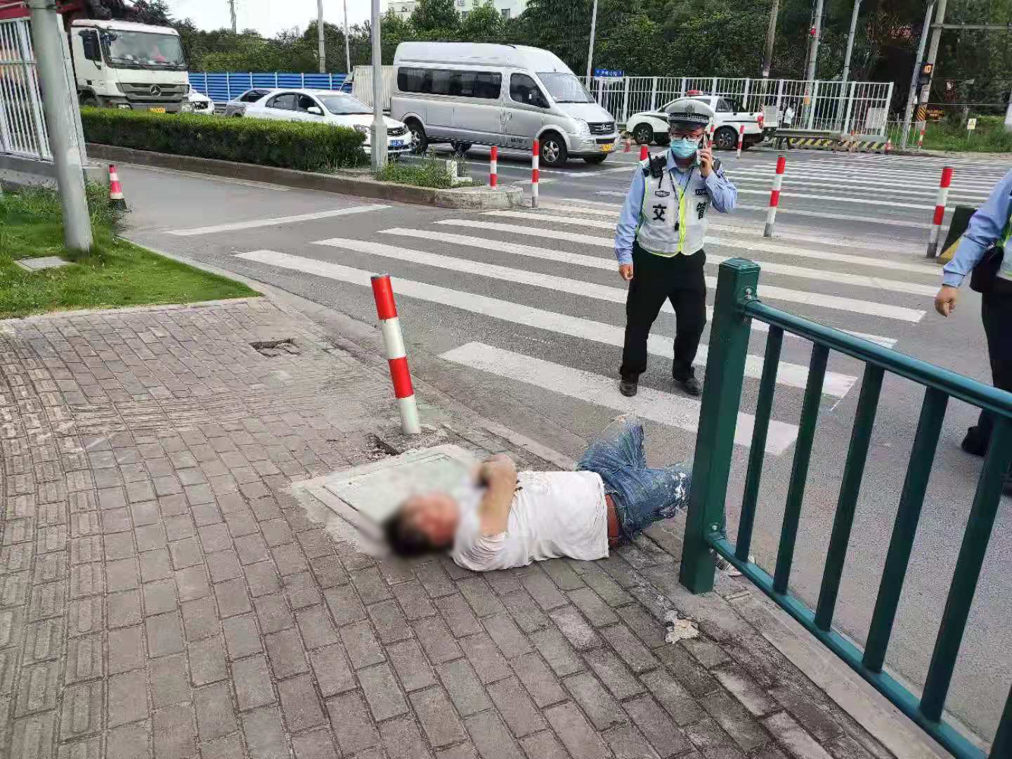 當(dāng)天7:20,昝金偉、張建建巡邏至上南路聯(lián)豐路路口時遇到一起交通事故,一名男子撞上了路邊的標(biāo)識桿,一動不動地躺在機動車道上。