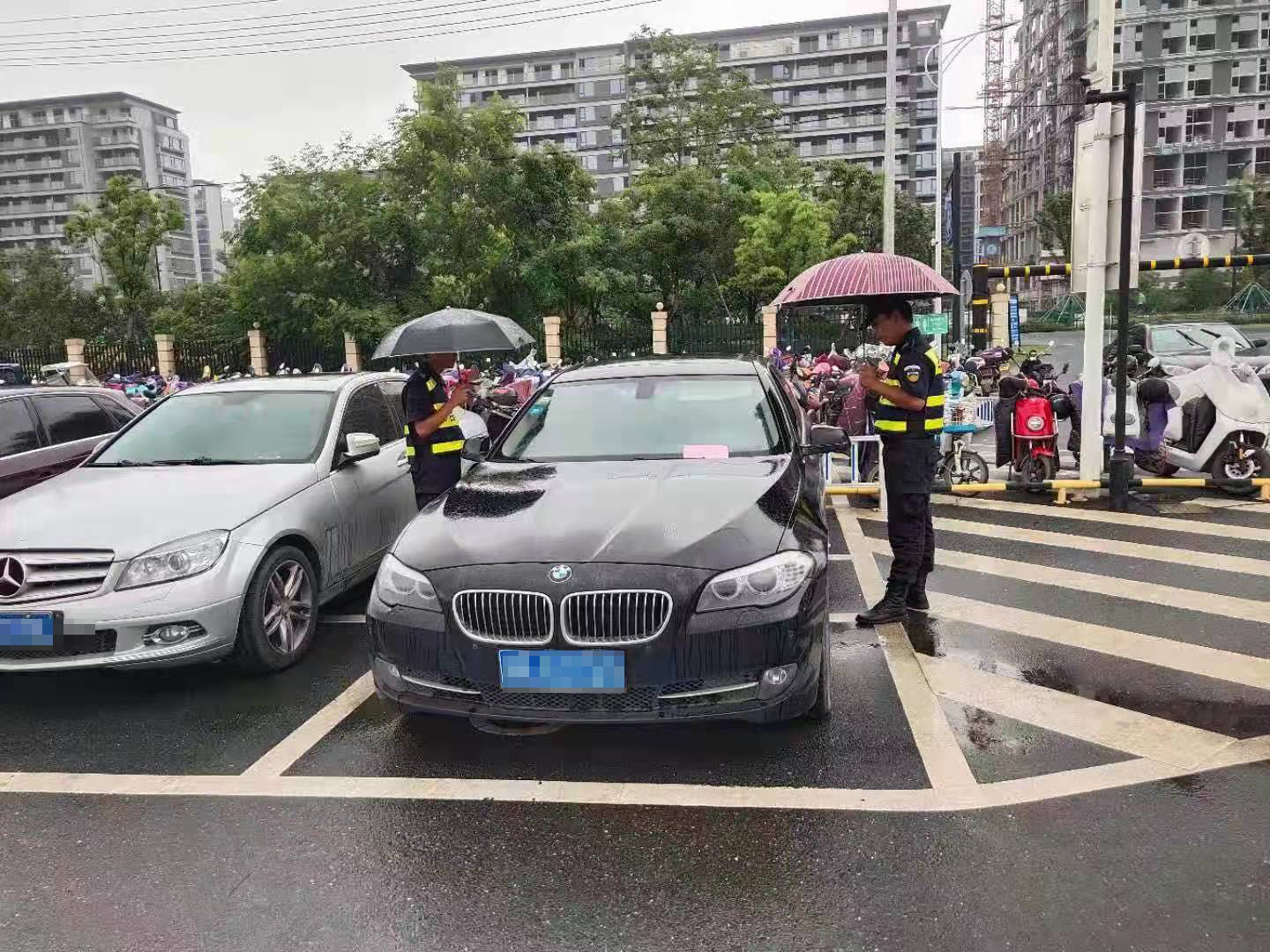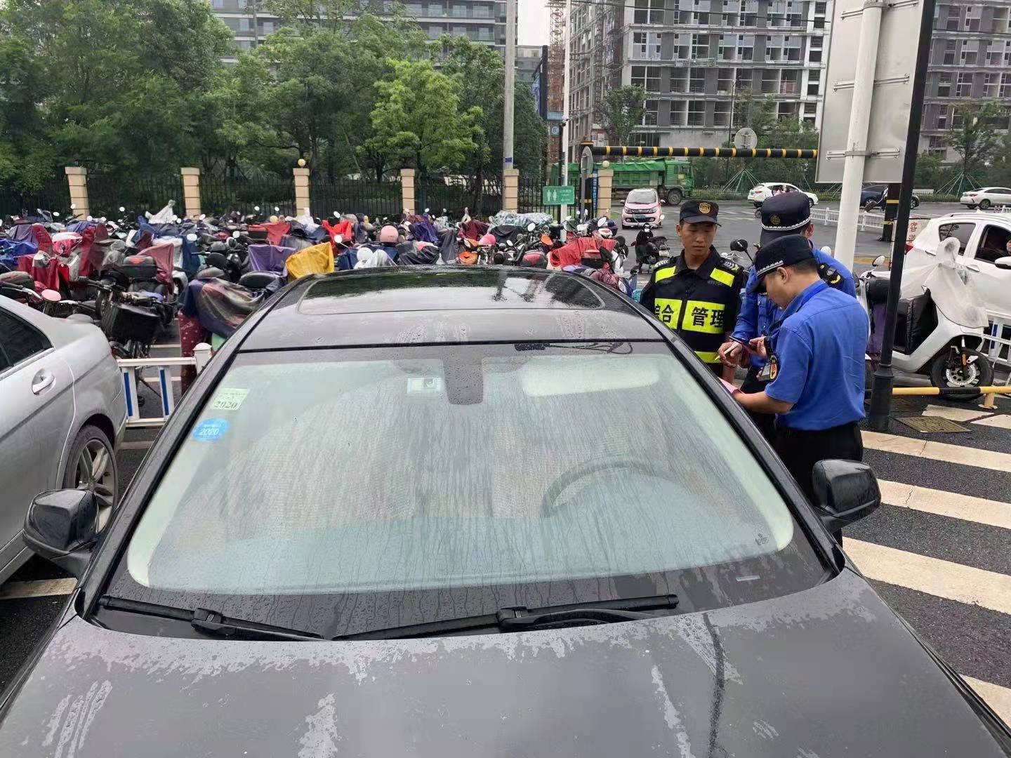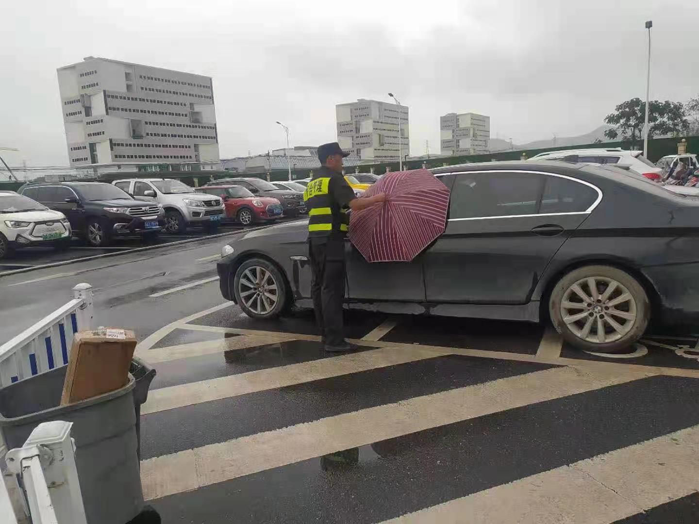 車主忘關(guān)車窗 隊員撐傘擋雨—良渚地鐵菜場項目隊員為車撐傘擋雨