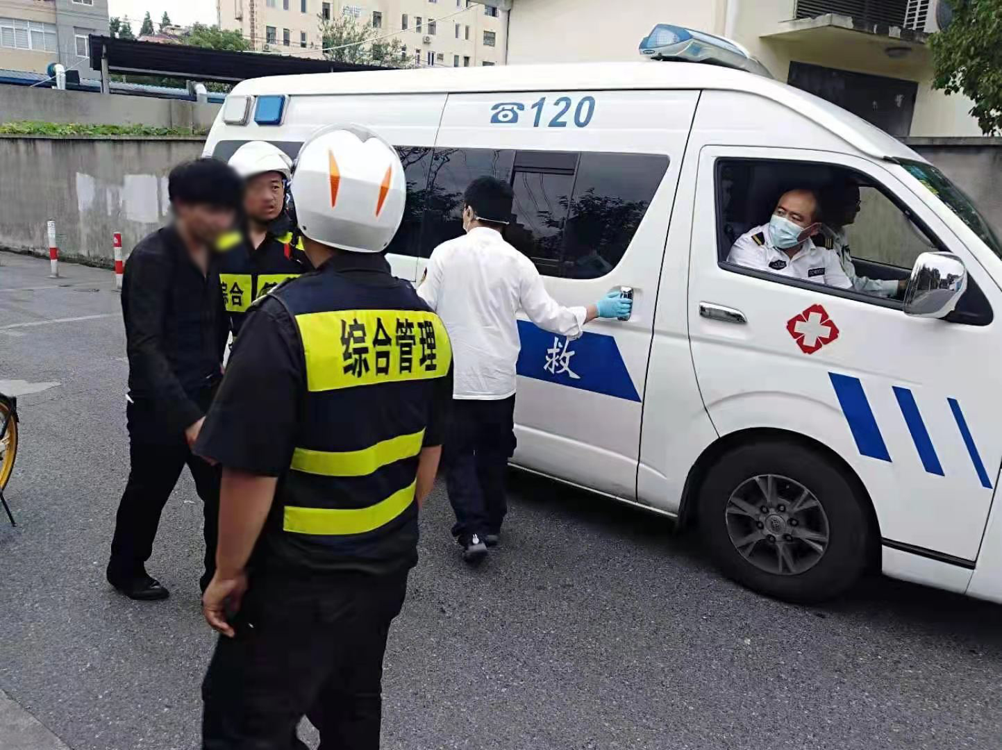 6月14日,宗保公司駐三林市容項目隊員張展展、張志恒救助倒地男子。