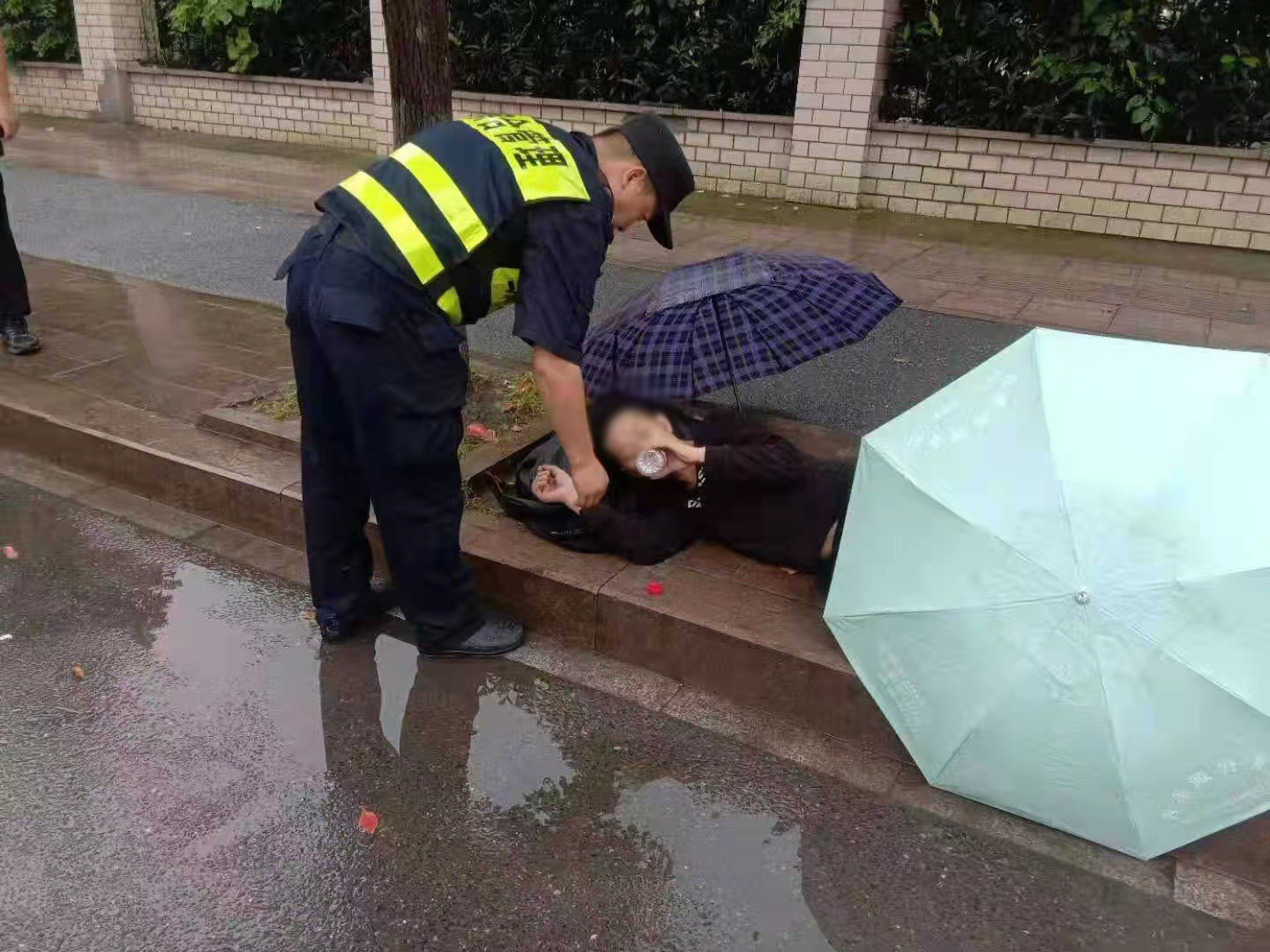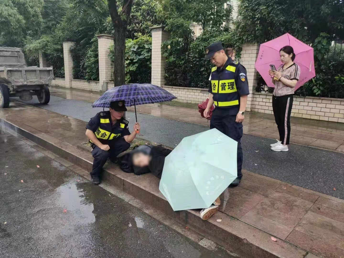 張騰剛走近男子就聞到一股濃烈的酒味,呂劍強嘗試叫醒男子,但醉酒男子沒有反應。此時正在下雨,兩人便撐起雨傘為其遮雨,并將情況向組長報告。