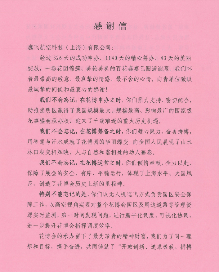 7月6日,鷹飛航空科技(上海)有限公司收到第十屆中國花卉博覽會執(zhí)委會指揮部送來的感謝信,信中對鷹飛公司花博會期間全力以赴助力保障展會安全有序平穩(wěn)運行表示感謝。