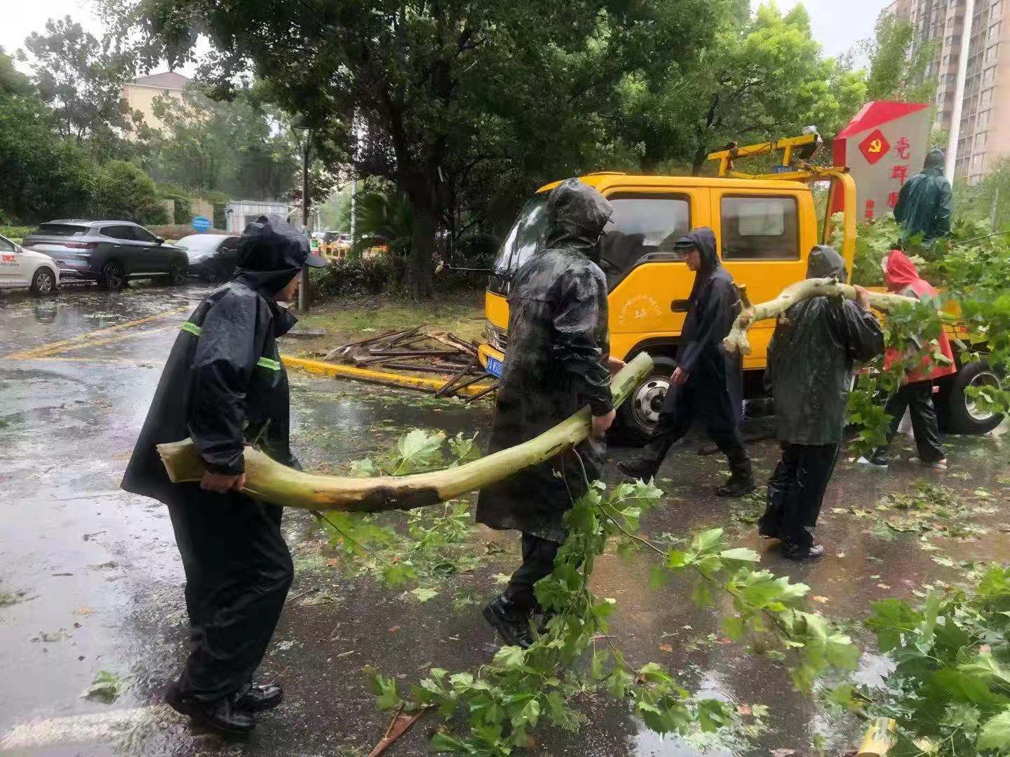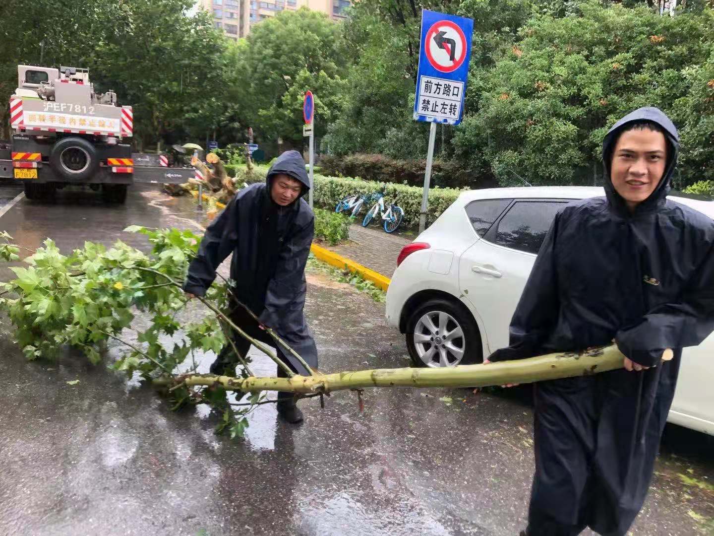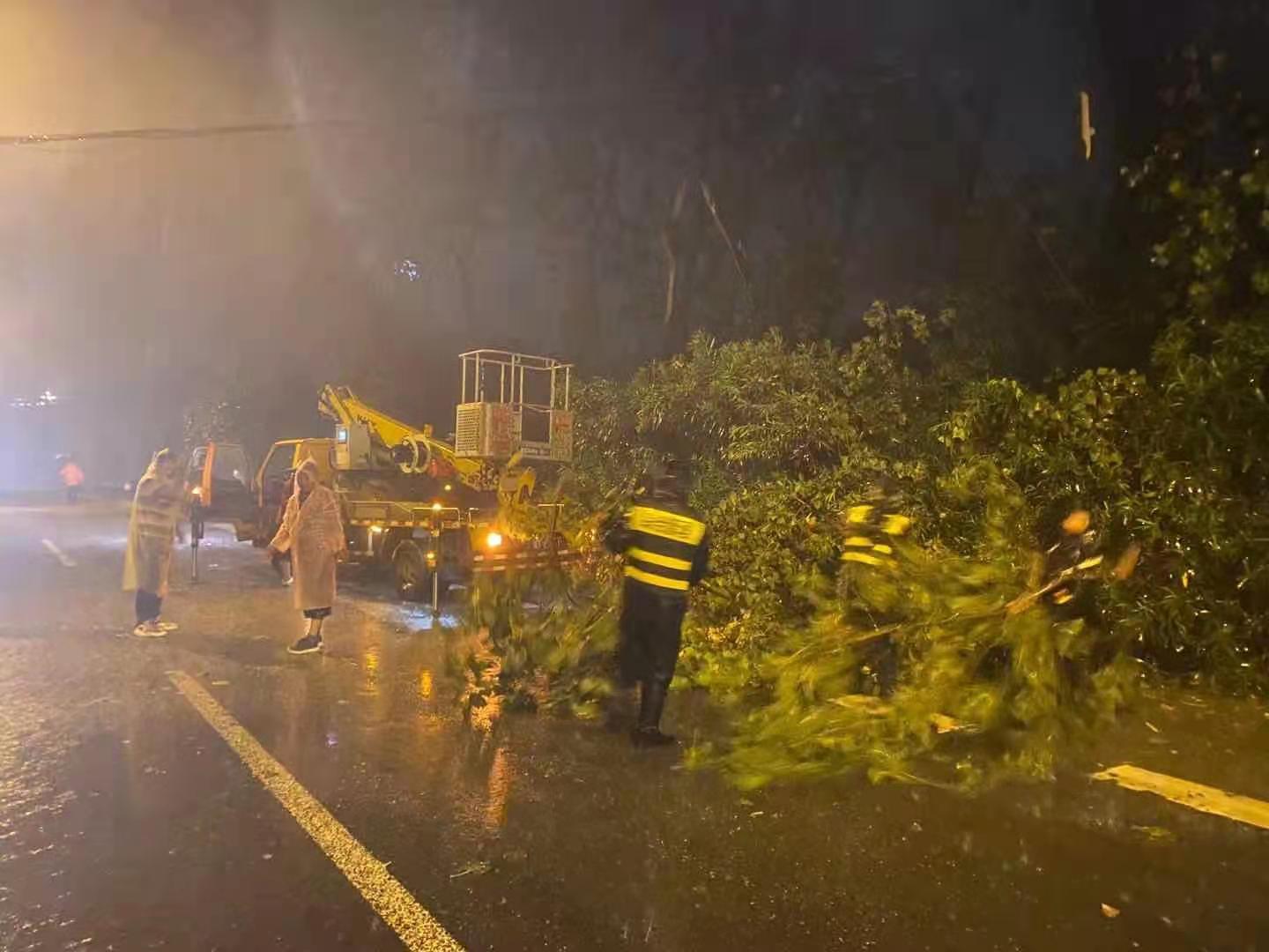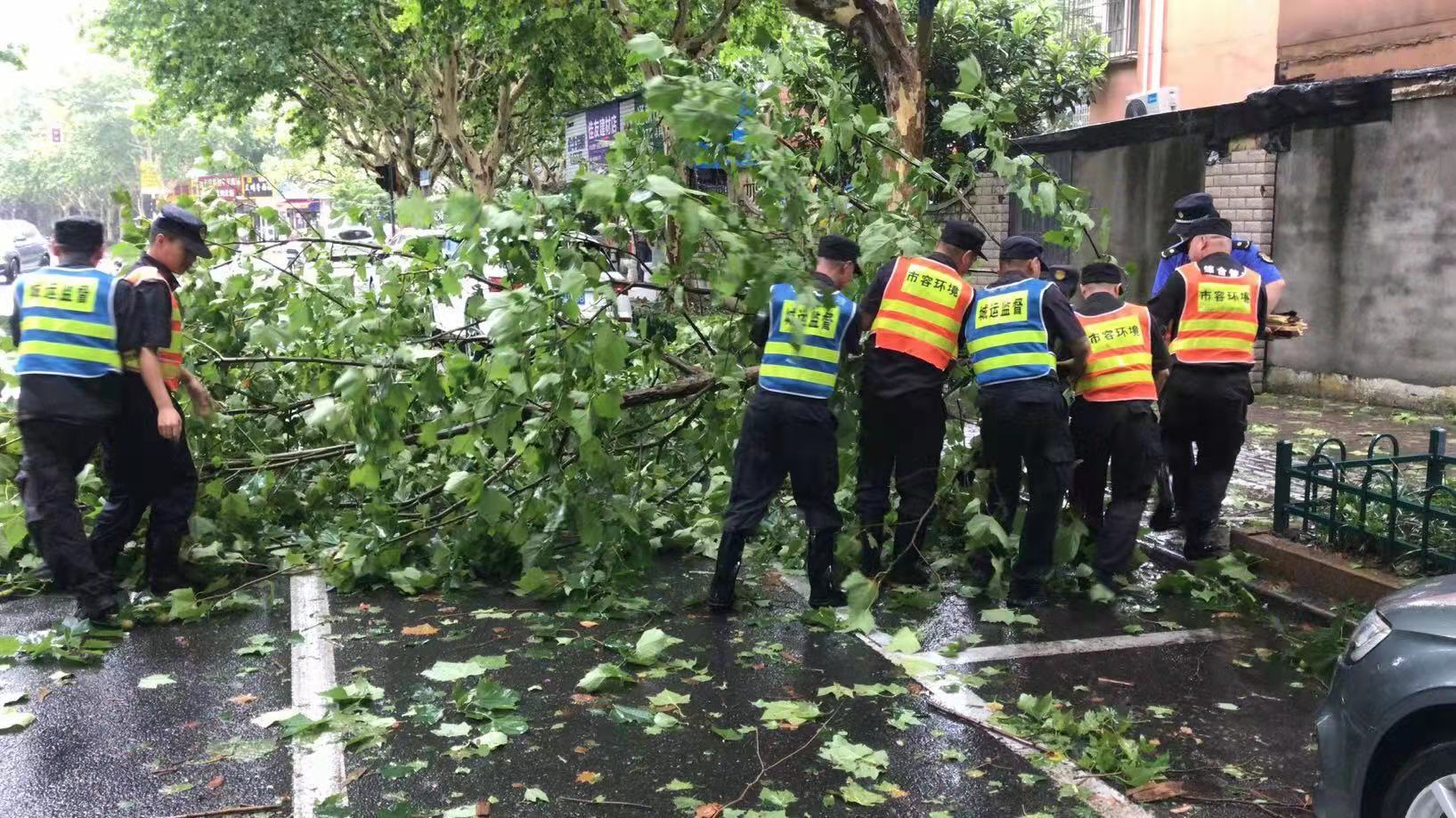 馬路兩旁,宗保隊(duì)員利用大風(fēng)暫停間隙,清理傾倒的樹(shù)木。