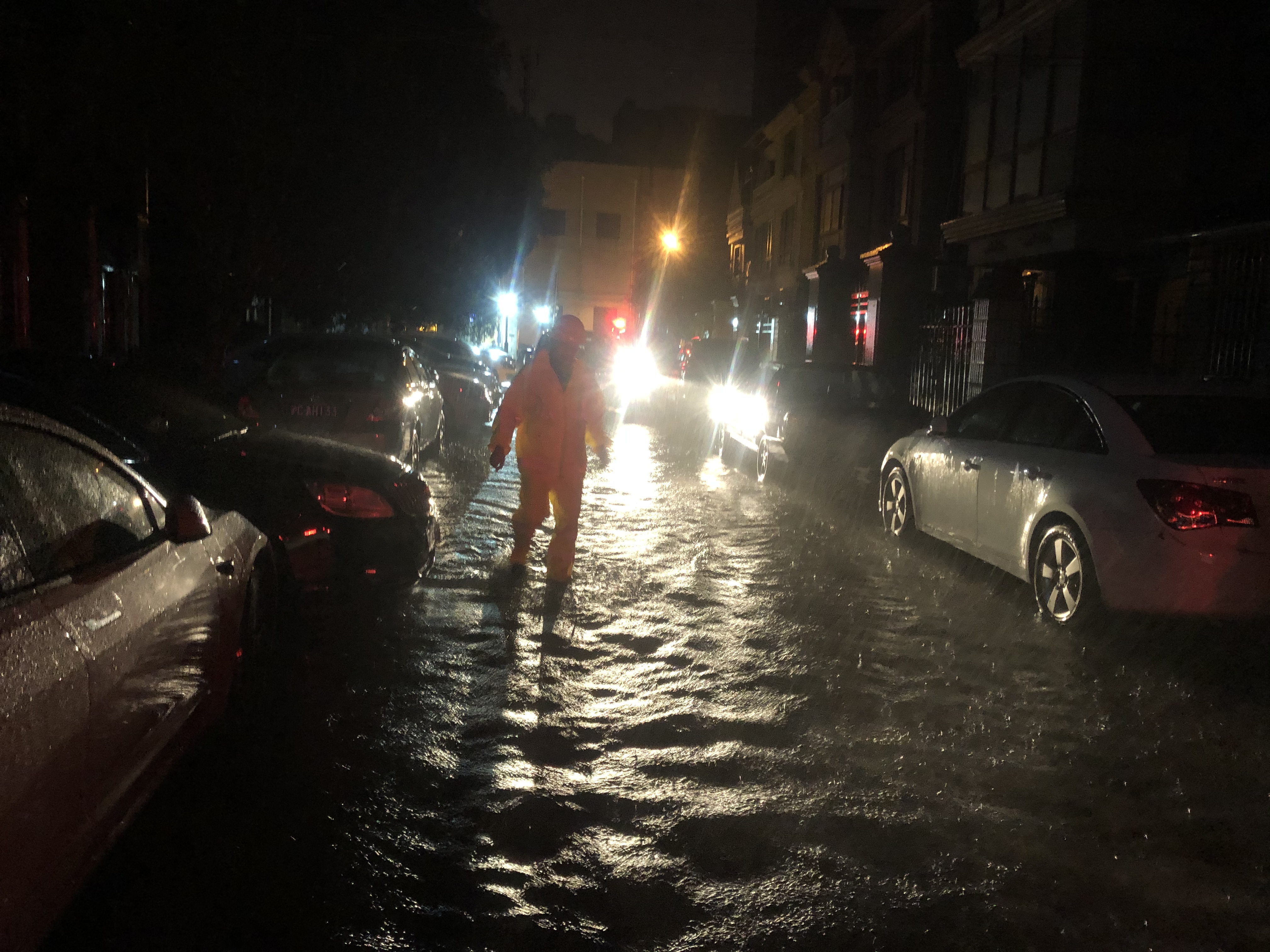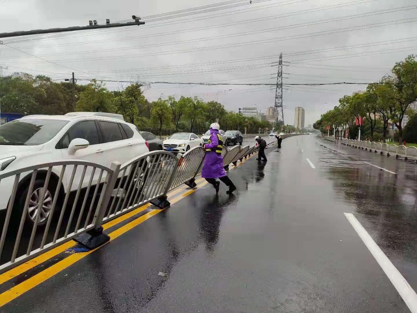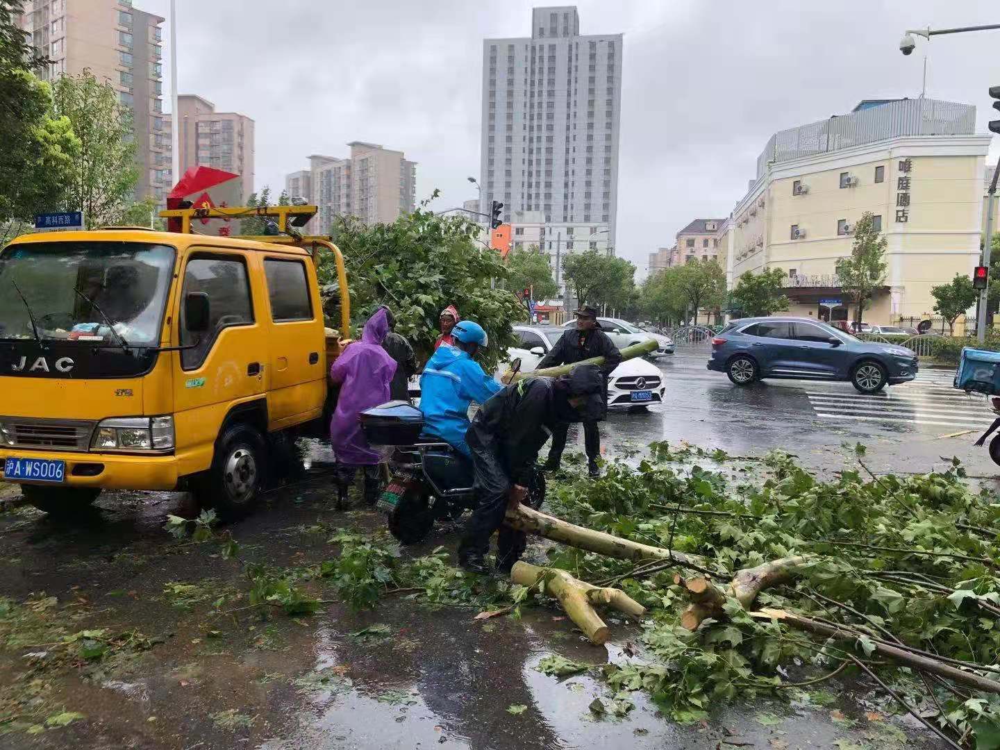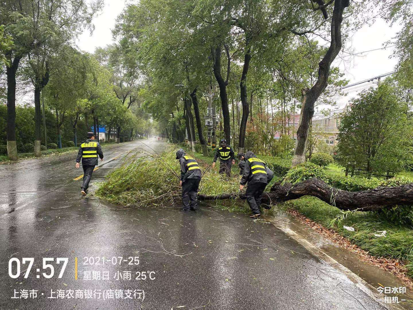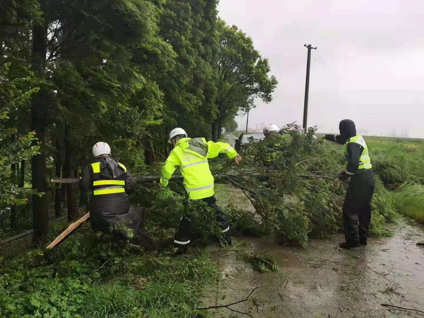 馬路兩旁,宗保隊(duì)員利用大風(fēng)暫停間隙,清理傾倒的樹(shù)木。