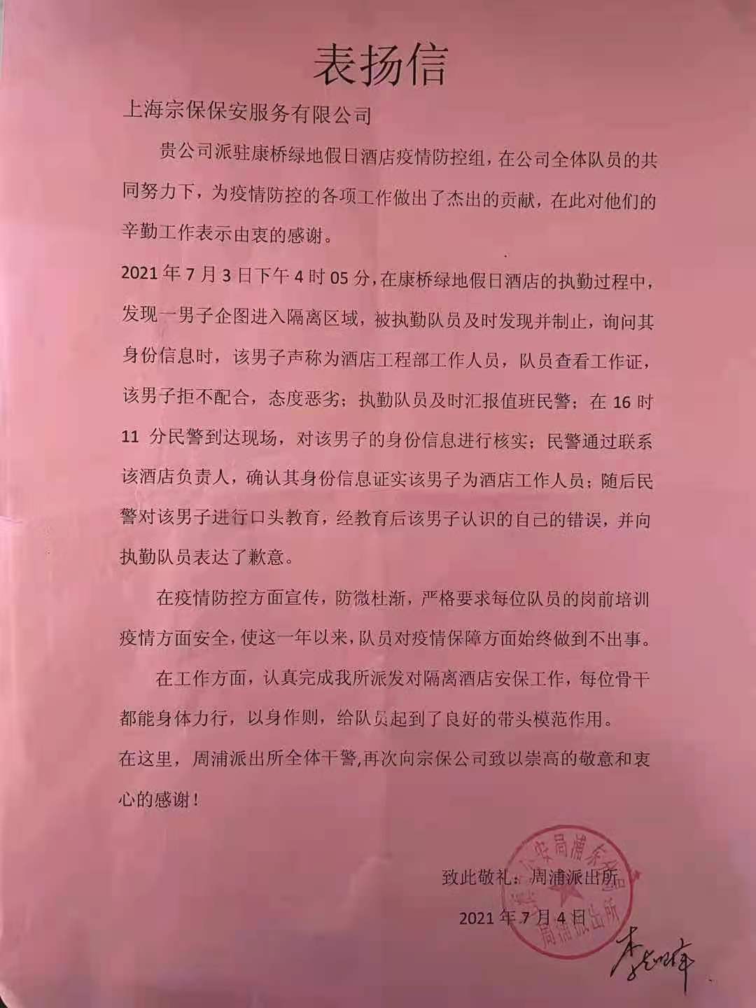 7月4日,宗保公司駐周浦輔警項目收到周浦派出所送來的一封表揚信,信中對公司駐疫情防控組全體隊員的辛勤付出提出表揚。