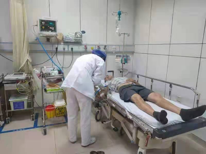 到醫(yī)院急診室時,老人呼吸急促,想嘔吐的癥狀明顯加重。李軍軍簡單地向醫(yī)生說明了老人的情況,醫(yī)生隨即開始診治。期間,孫明峰一直守護(hù)在老人身邊,李軍軍急切地與老人家屬聯(lián)系。