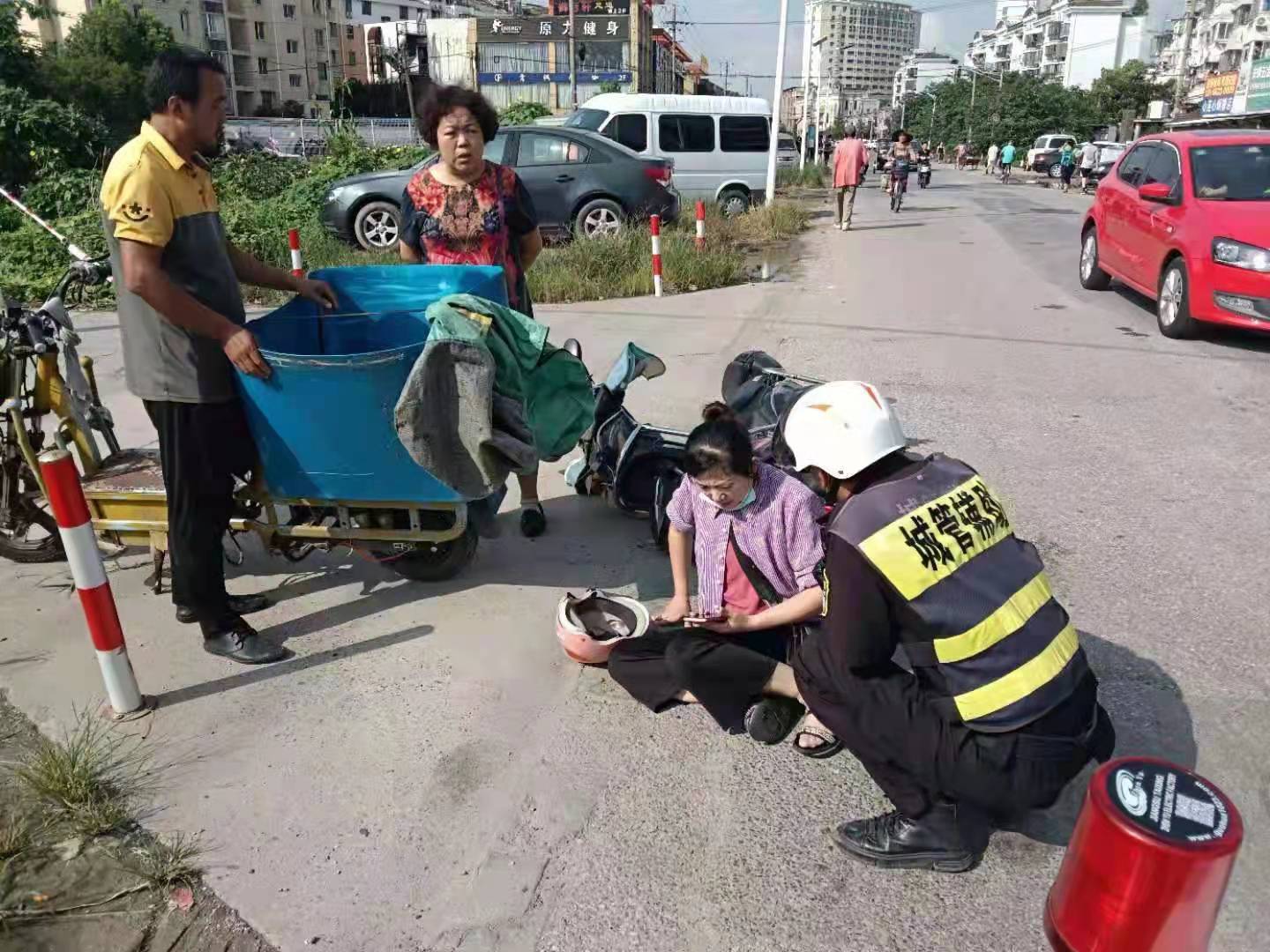 當(dāng)日8:20左右,金宏利在川周公路巡查時,看到一位中年女子坐在地上,一輛電瓶車倒在路旁,便隨即上前詢問。