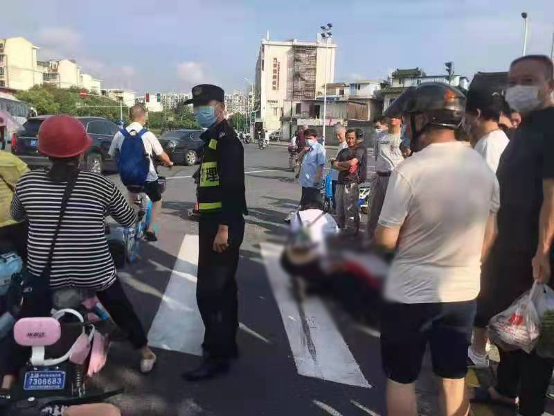 原來,中年女子騎車與另一輛電瓶車相撞,摔倒在地,對方當(dāng)事人被嚇的手足無措。因頭部著地致頭疼厲害,中年女子請金宏利幫助,撥打了周浦派出所電話。