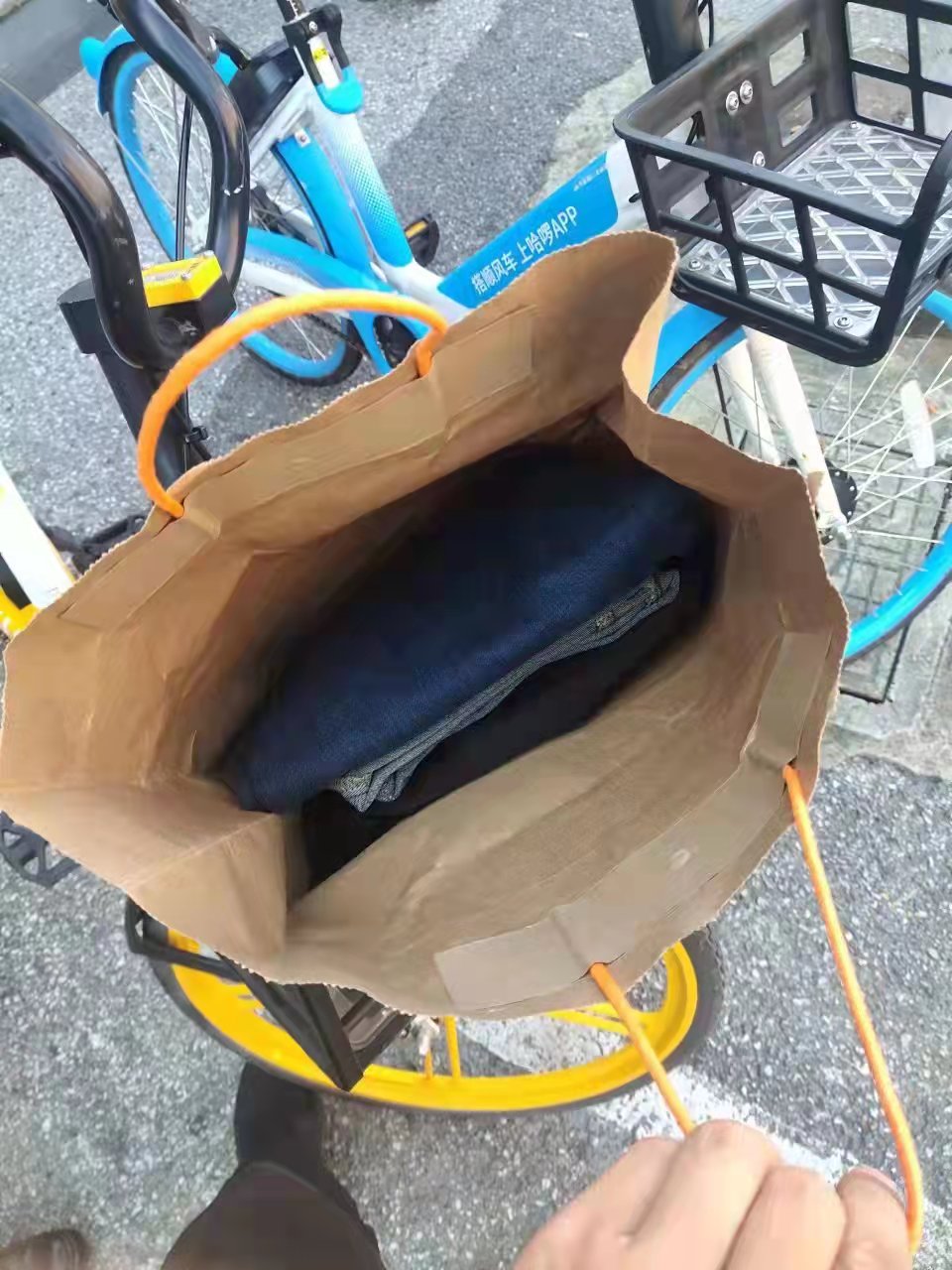 當(dāng)天9:30,張陽(yáng)巡邏到年家浜路康沈路路口時(shí),發(fā)現(xiàn)路邊一輛共享單車車筐里有一個(gè)袋子,周圍沒(méi)有人。