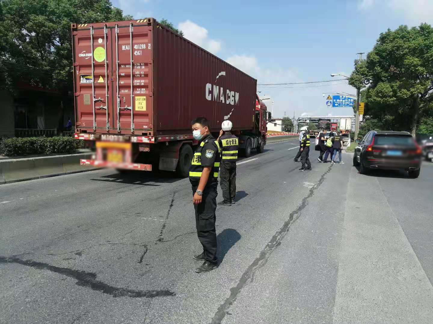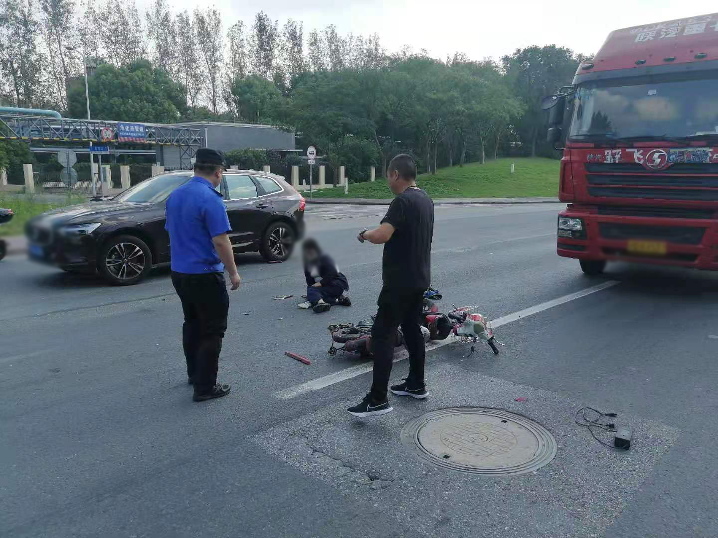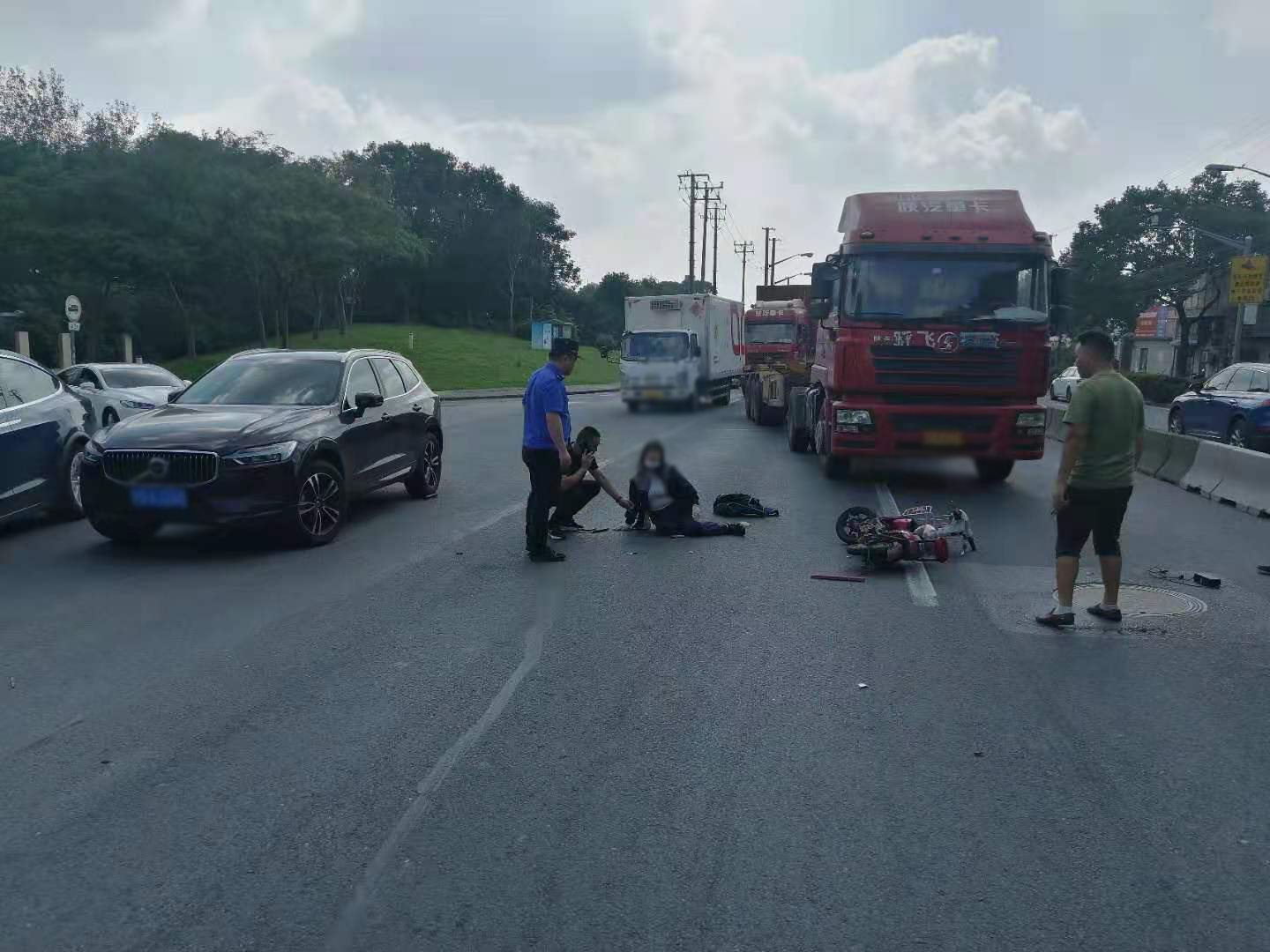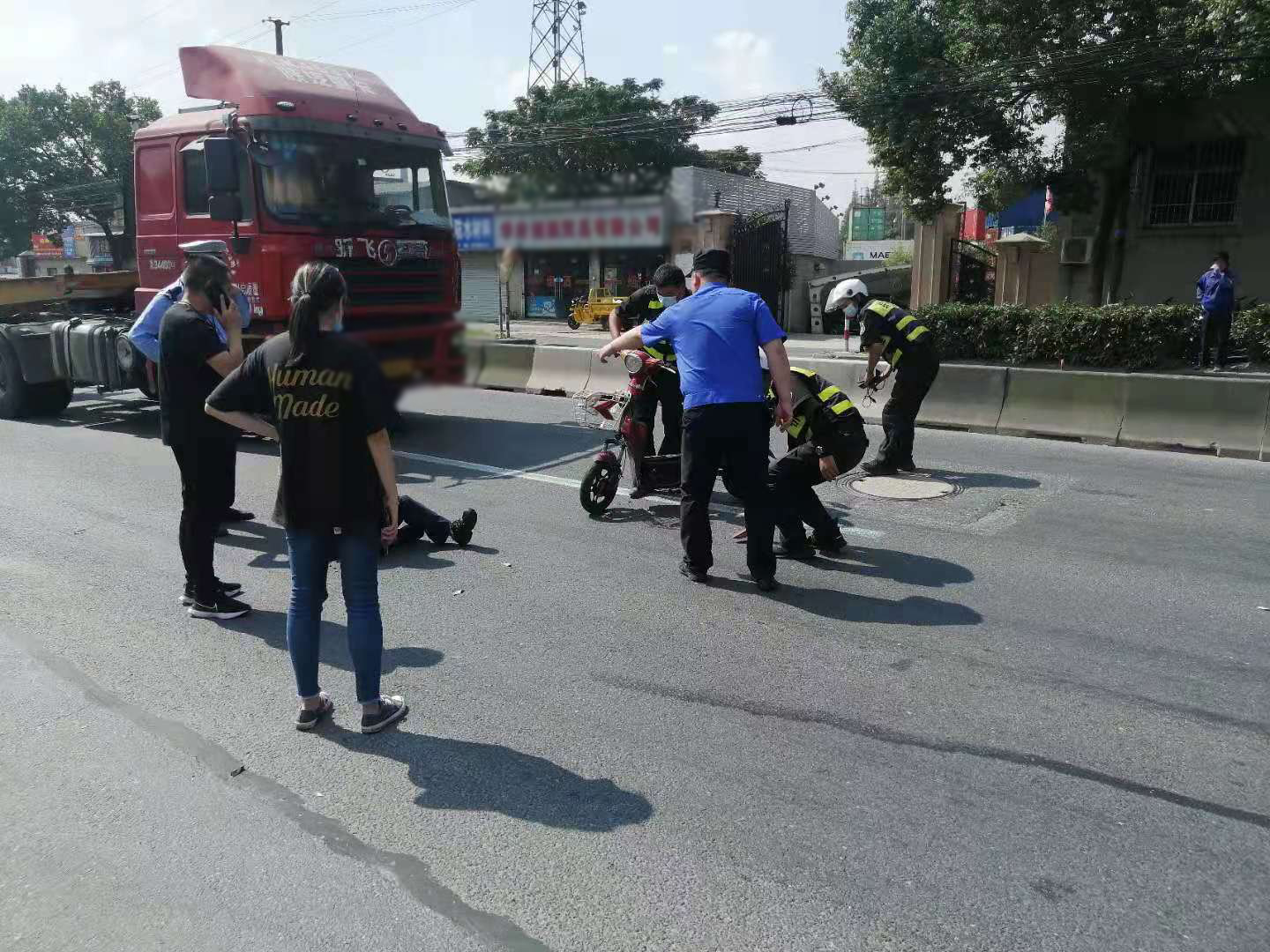 當(dāng)日10:00,陳睿、李旭龍、路標(biāo)、秦金奎在城管中隊執(zhí)法員益衛(wèi)華的帶領(lǐng)下,驅(qū)車在高橋鎮(zhèn)浦東北路高荷路路口巡邏時,遇到一起交通事故,一輛集卡車與一輛電瓶車相撞,騎電瓶車女子癱坐在地上。