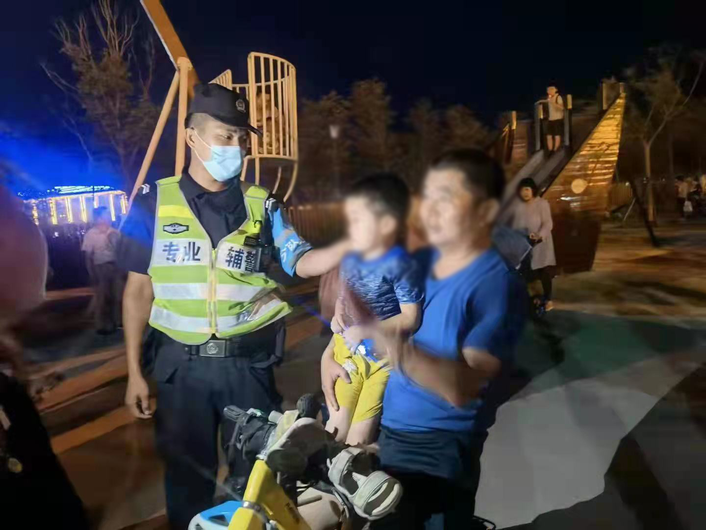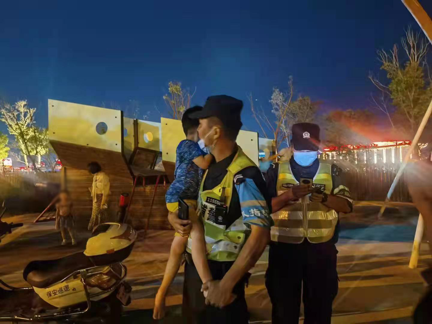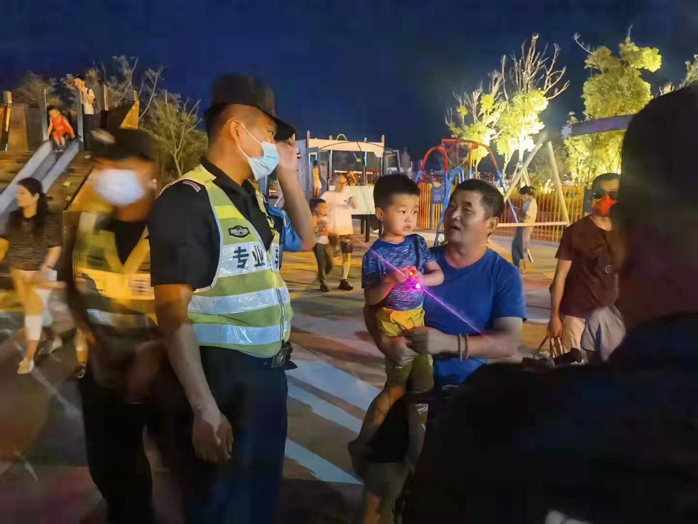 當(dāng)日18:30,滴水湖環(huán)湖景觀帶兒童樂園附近,一名游客與5歲的孩子走散,心急如焚,焦急地向宗保隊員張楠楠求助。