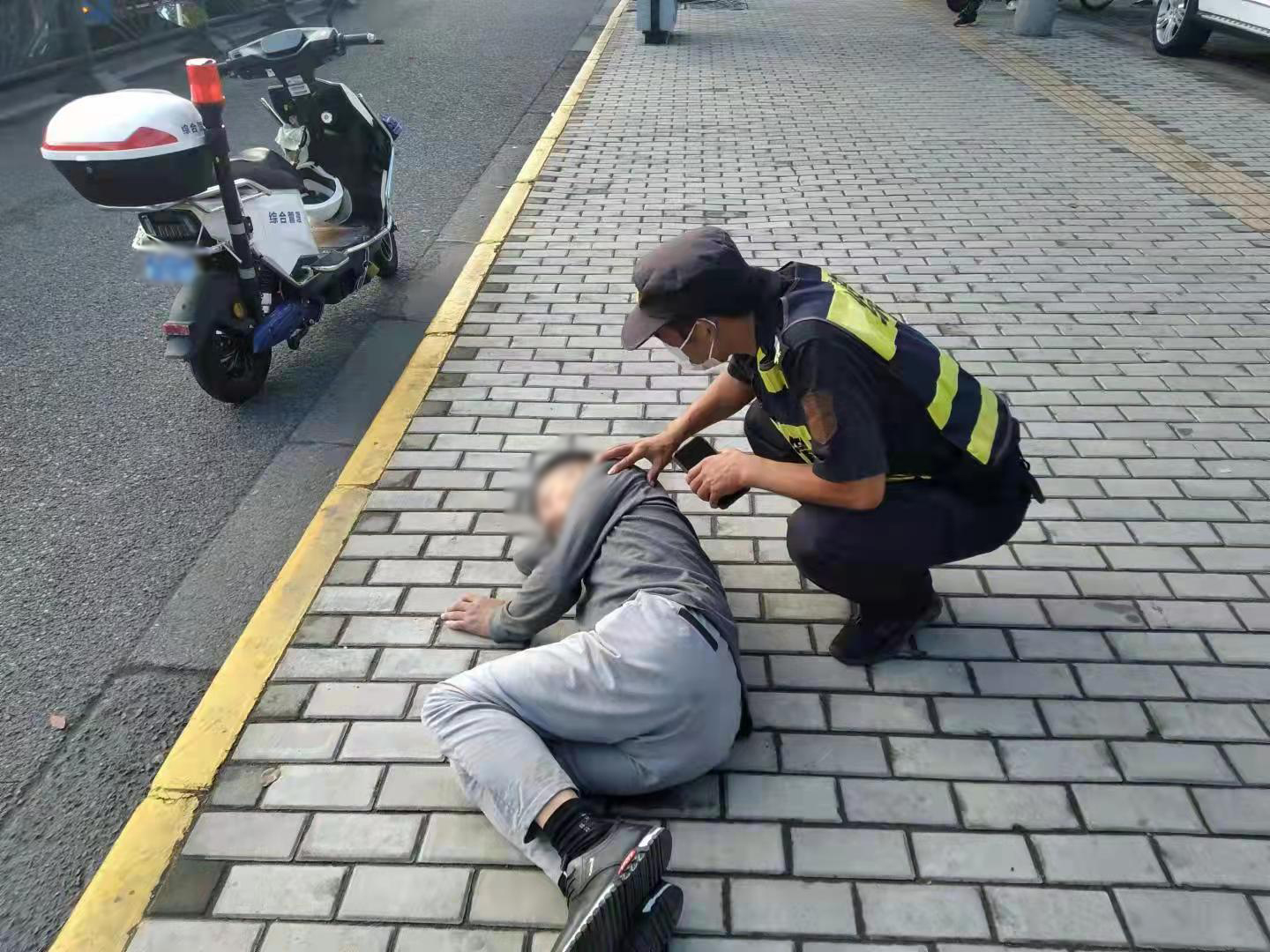 當(dāng)日9:15,嚴(yán)衛(wèi)基、張龍在閑富中路巡邏時,看到閑林街道辦事處門口有一名女子躺在地上,一輛電動車摔倒在旁,一個男子正在和她說話。