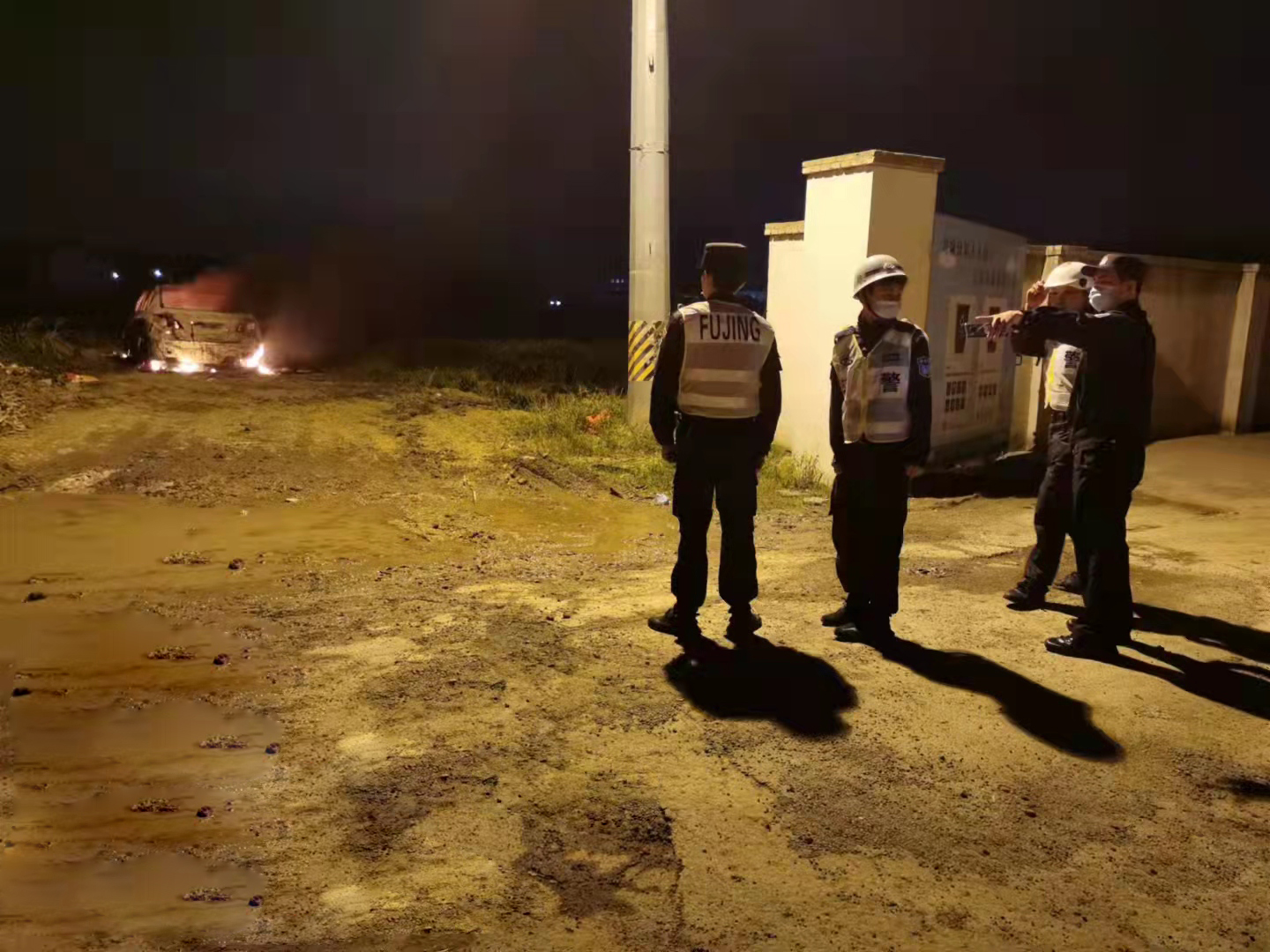 當(dāng)日23:50,王崇、邵輝、潘祥海和班組長(zhǎng)孫魁巡邏至沔北村558弄附近時(shí),發(fā)現(xiàn)路邊一輛現(xiàn)代牌轎車著火,現(xiàn)場(chǎng)冒著濃煙。