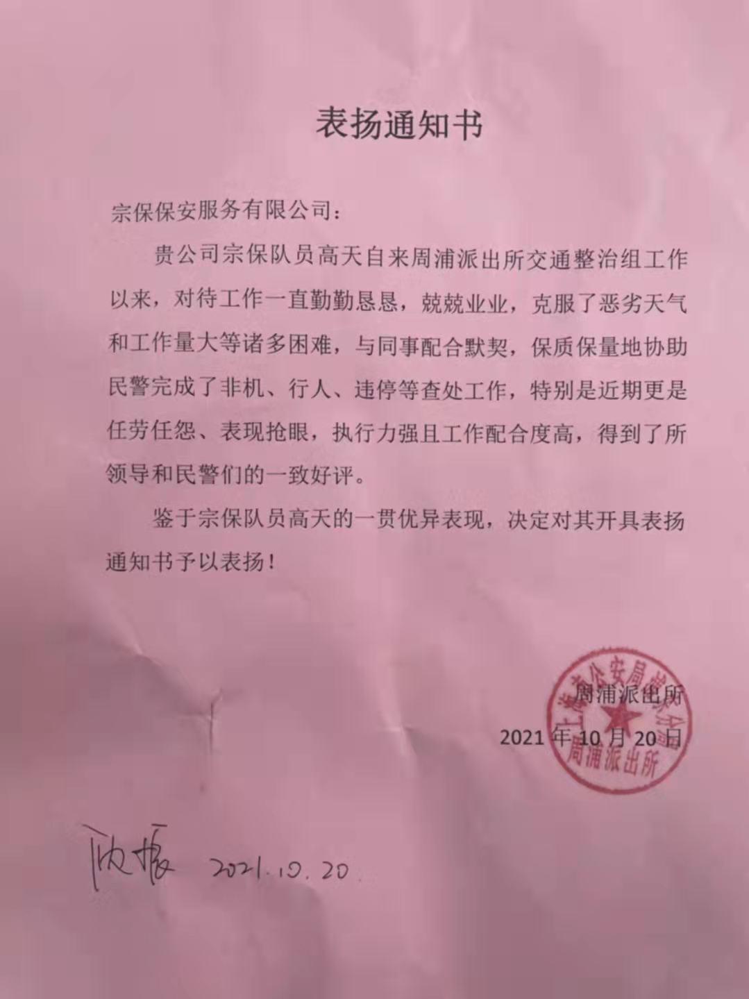 10月20日,宗保公司駐周浦派出所輔警項(xiàng)目收到周浦派出所送來的一封表揚(yáng)信,信中對宗保隊(duì)員高天在工作中忍辱克制、規(guī)范執(zhí)法的行為提出表揚(yáng)。