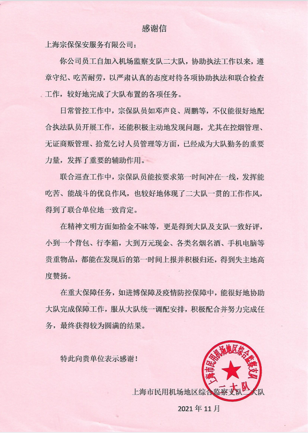 11月15日,宗保公司駐機(jī)場(chǎng)防疫項(xiàng)目收到上海市民用機(jī)場(chǎng)地區(qū)綜合監(jiān)察支隊(duì)二大隊(duì)送來的感謝信,信中對(duì)項(xiàng)目隊(duì)員們的良好工作表現(xiàn)給予了充分肯定。