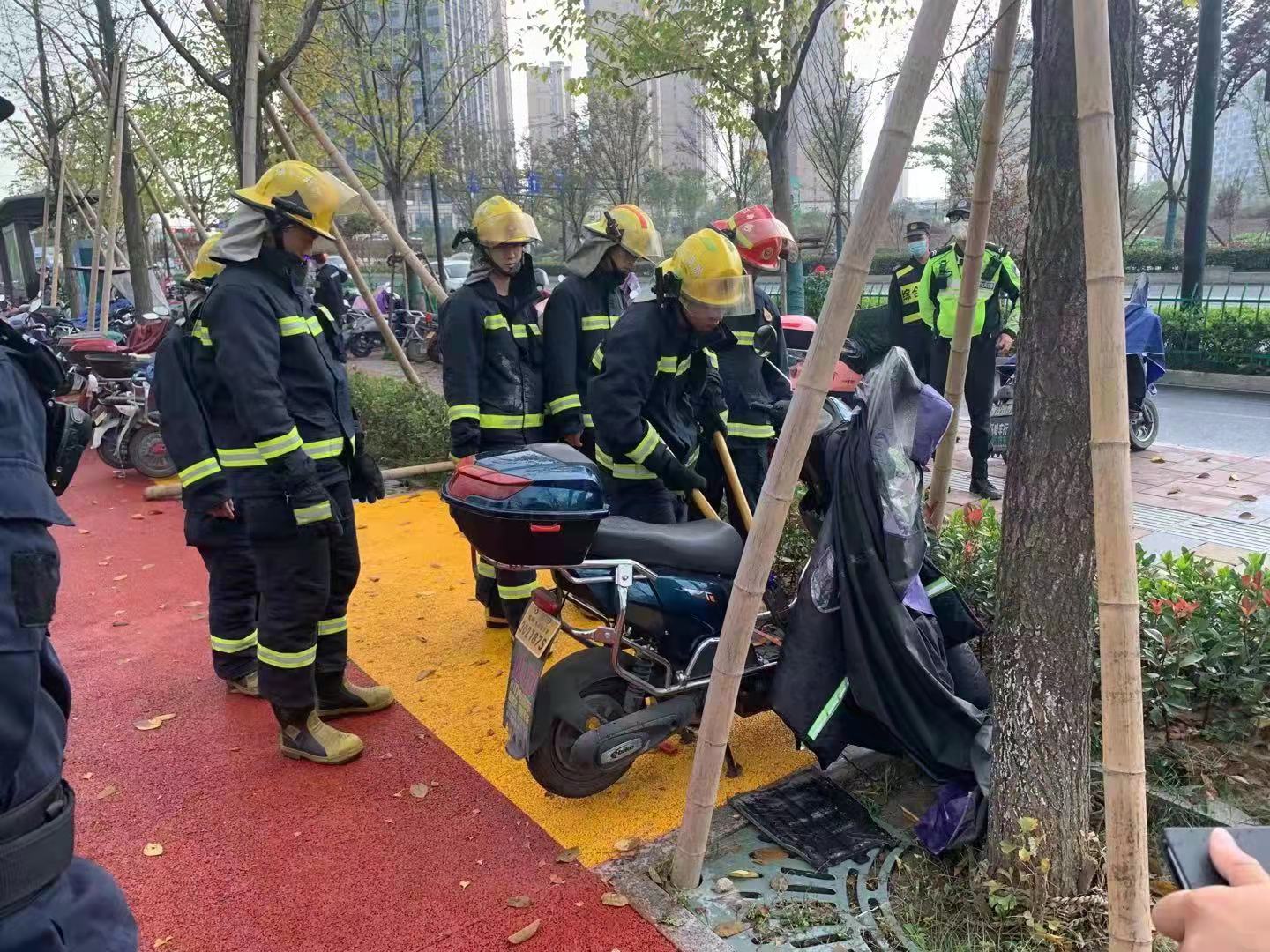 11月6日,浙江民泰駐良渚地鐵菜場項目隊員協(xié)助應急救援人員處理著火電瓶車。