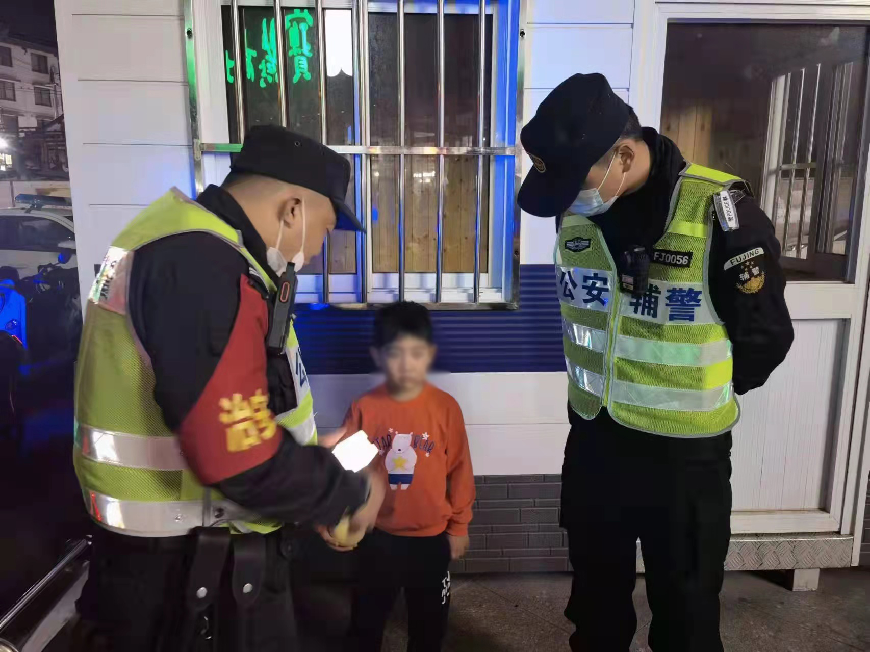 王騰一邊安撫著小男孩,一邊詢問其父母的特征和聯(lián)系方式,但因男孩年齡太小講不清楚。組長關毅亮便安排王騰和宋現(xiàn)震去寶燕商城,看有沒有家長在尋找孩子,同時將情況上報派出所值班室。