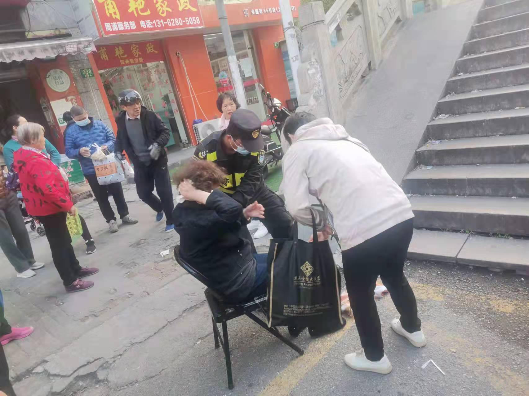 在等救護車期間,細心的趙春雷從旁邊商鋪借來一把椅子,將阿姨扶坐在椅子上,以免躺在地上著涼,并幫忙電話通知了阿姨家人。