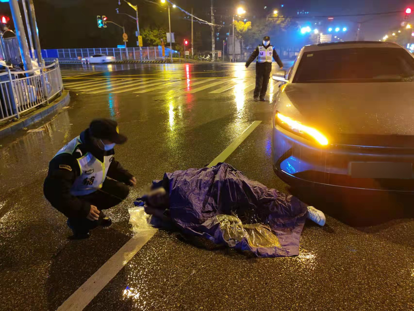 考慮到雨天路滑,再加上晚上光線不好,過往車輛速度又快,為避免二次事故的發(fā)生,兩人便對過往車輛進行交通引導。
