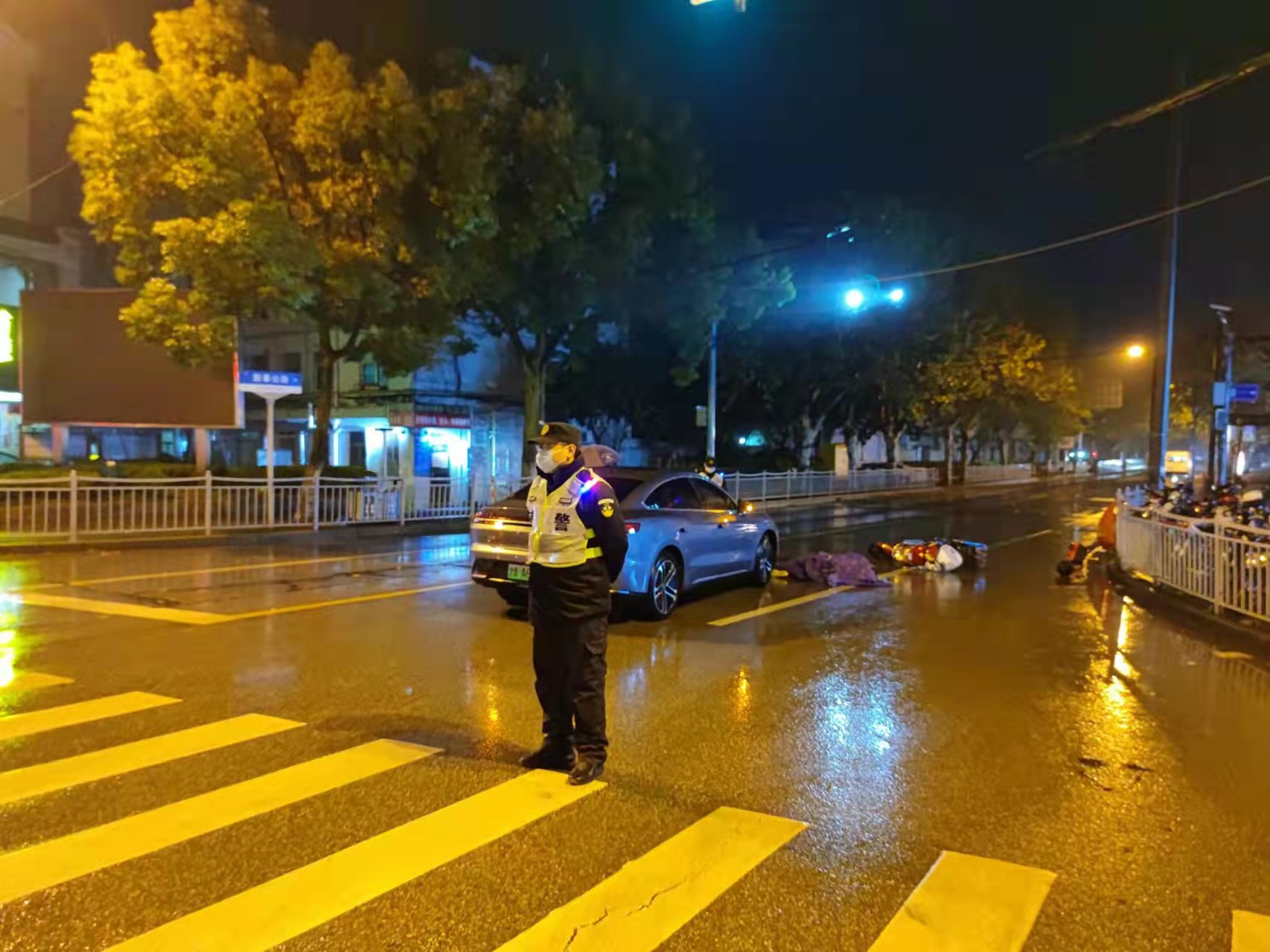 當日23:10,李俊書、梁珪武在新奉公路滬南公路路口值勤時,一輛轎車與一輛電瓶車發(fā)生碰撞,騎電瓶車男子被摔倒在地。
