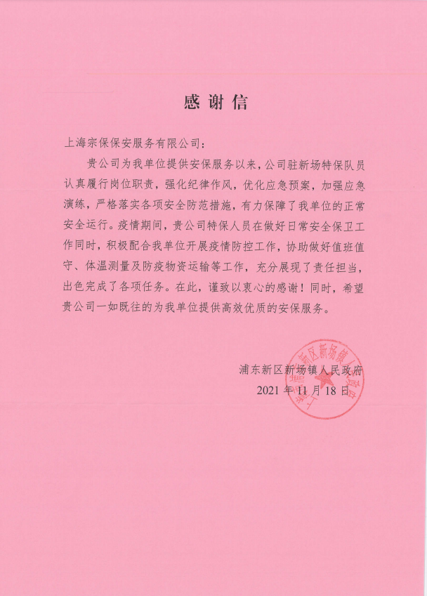 11月18日,宗保公司收到浦東新區(qū)新場鎮(zhèn)人民政府的感謝信,信中對宗保隊員履職盡責的工作表現(xiàn)給予了充分肯定。
