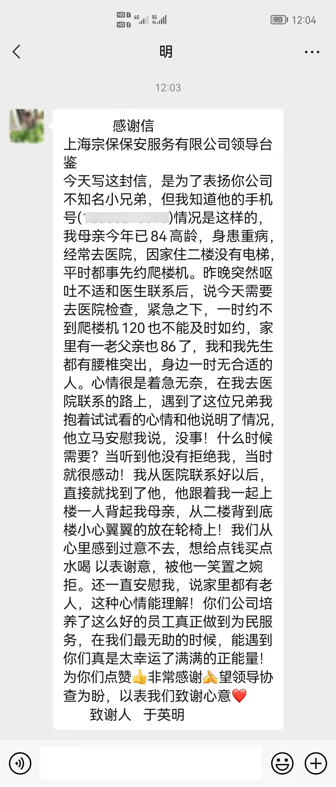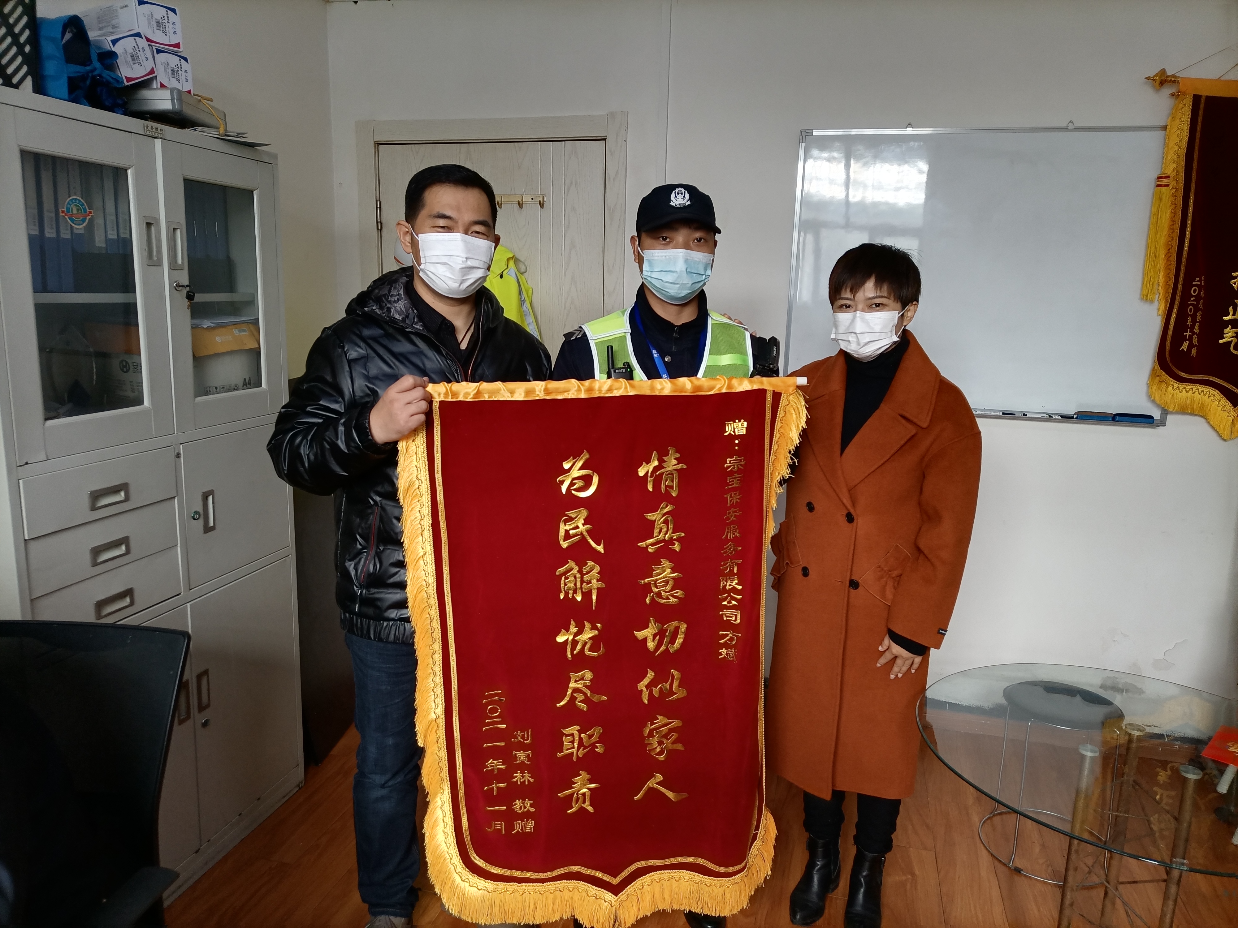 11月28日,宗保公司駐閔行莘莊梅隴輔警項(xiàng)目收到市民劉女士送來的一面繡有“為民解憂盡職責(zé) 情真意切似家人”的錦旗和一封感謝信,感謝隊(duì)員方斌熱心助人的行為。