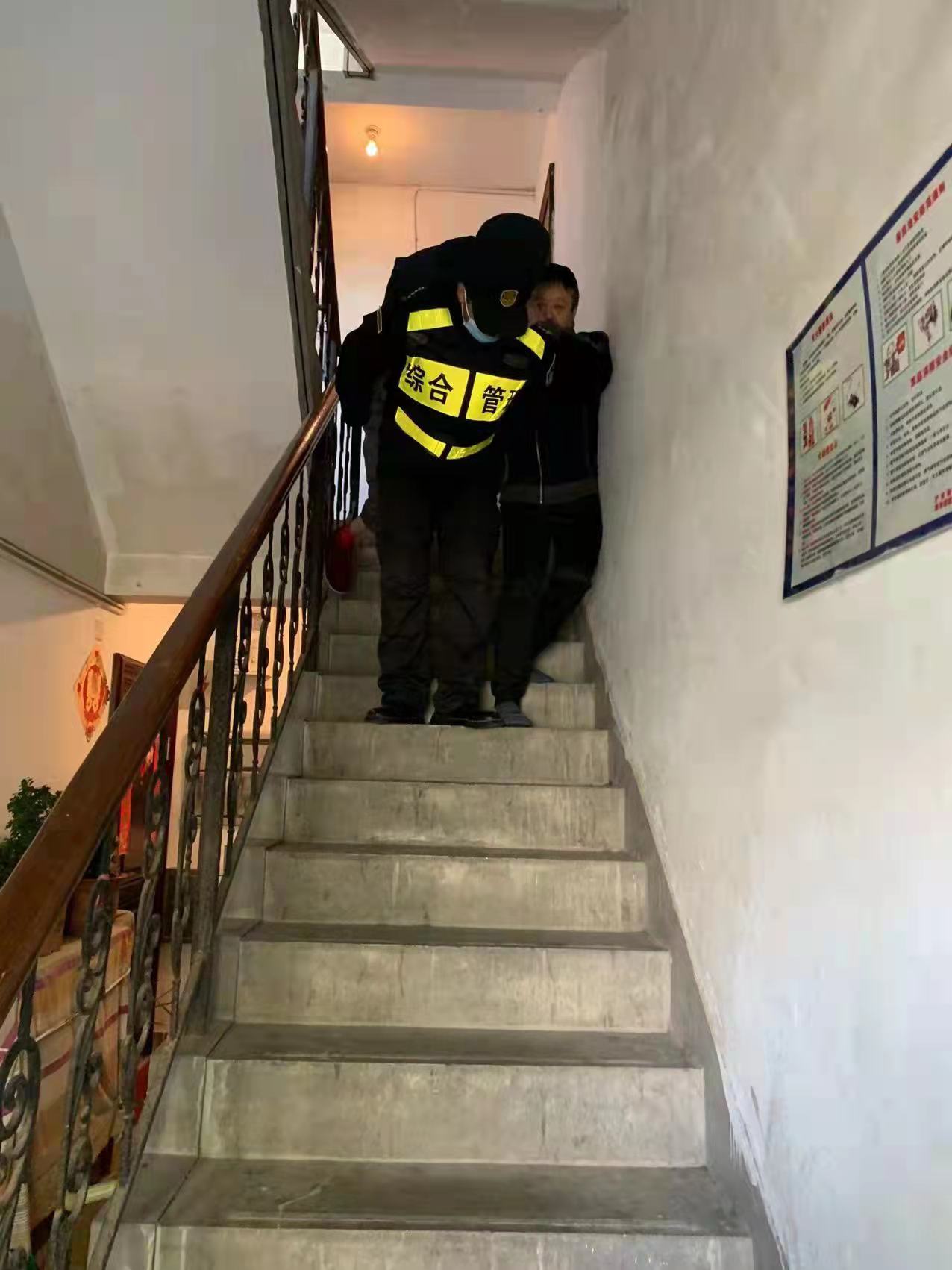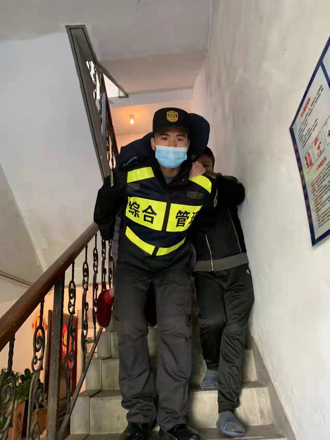 老人看病下樓難 隊(duì)員背著暖人心—滬東市容項(xiàng)目隊(duì)員背老人下樓看病