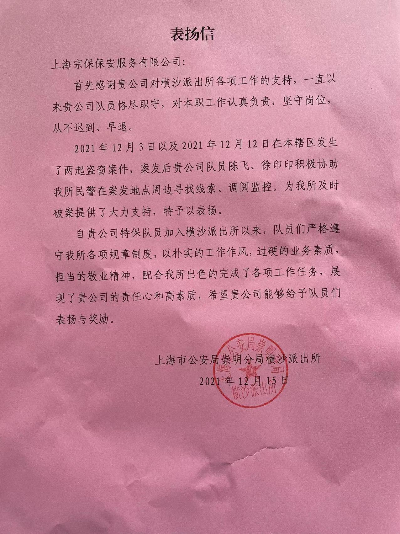 12月15日,宗保公司駐崇明區(qū)橫沙鄉(xiāng)項目收到崇明區(qū)公安分局橫沙派出所的表揚信,表揚恪盡職守、工作負責的宗保隊員。
