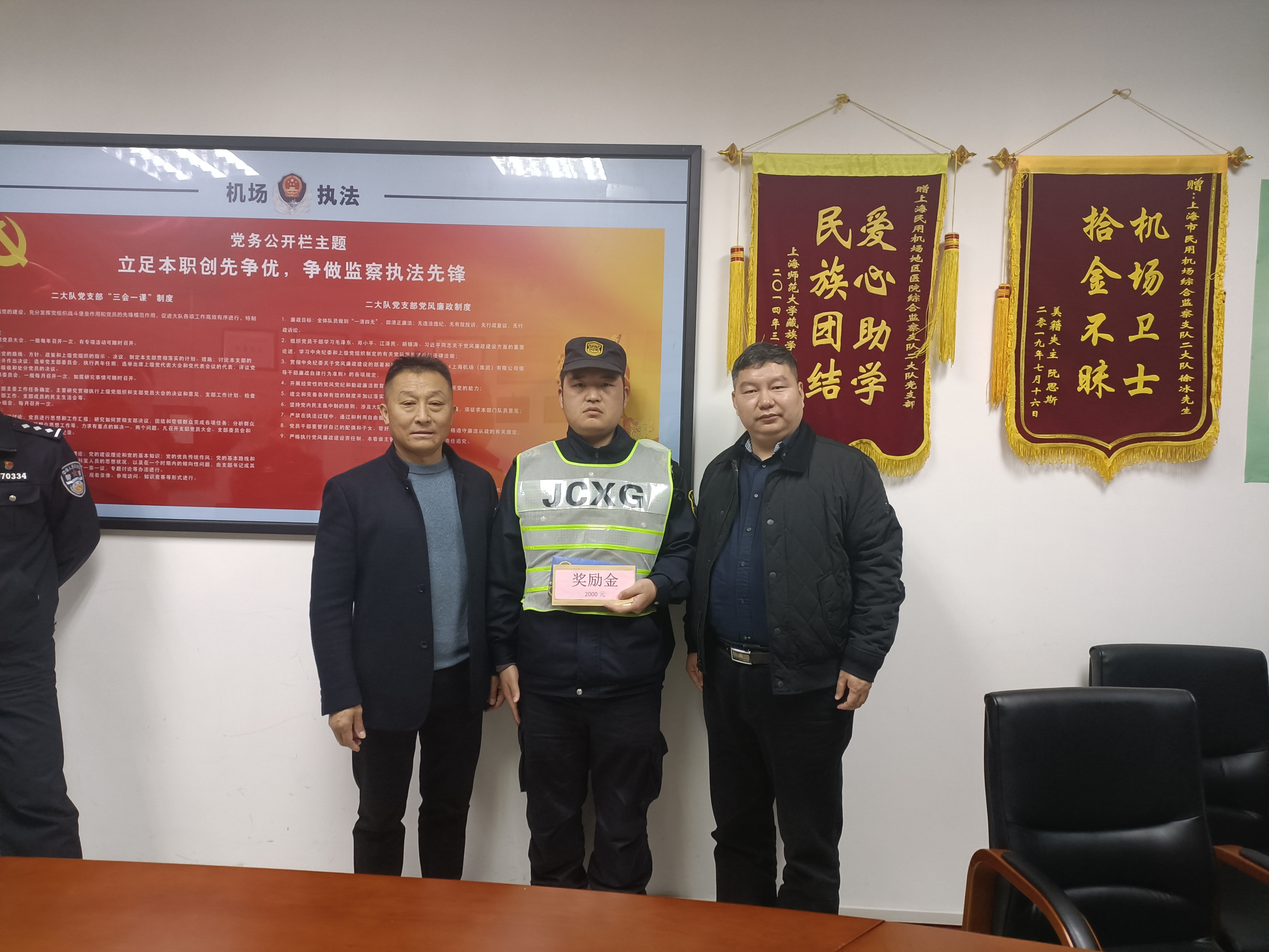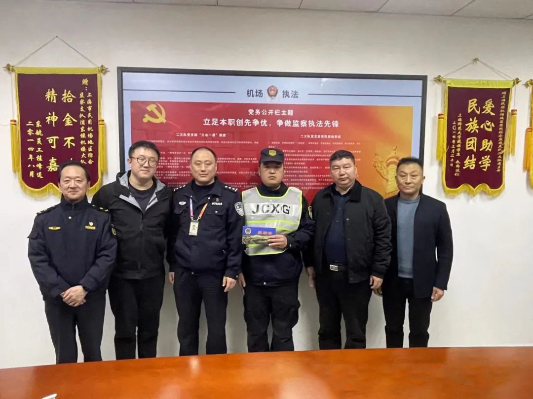 12月17日,浦東機場候機樓派出所邀請上海市民用機場地區(qū)綜合監(jiān)察支隊副支隊長王劍豪、二大隊大隊長張立、副大隊長唐軍、公司副總經(jīng)理楊璞、侯留勇等領(lǐng)導(dǎo)上門為牛占杰送獎,以表彰其在“三聯(lián)”工作中的突出表現(xiàn)。同時,公司副總經(jīng)理楊璞、侯留勇代表公司創(chuàng)始人馮中保向牛占杰頒發(fā)專項獎勵金,以表揚獎勵牛占杰同志為公司發(fā)展所作出的貢獻(xiàn)。