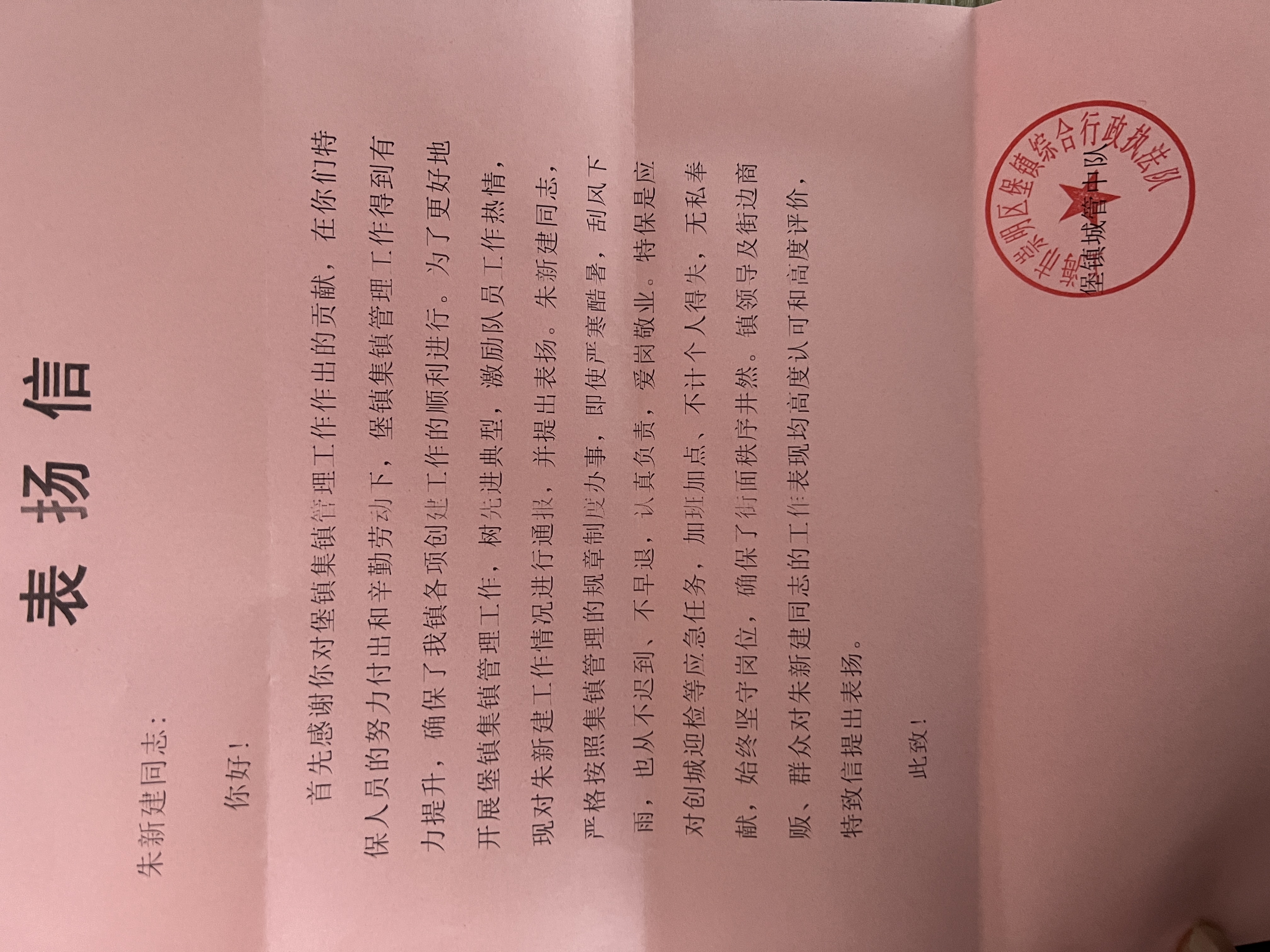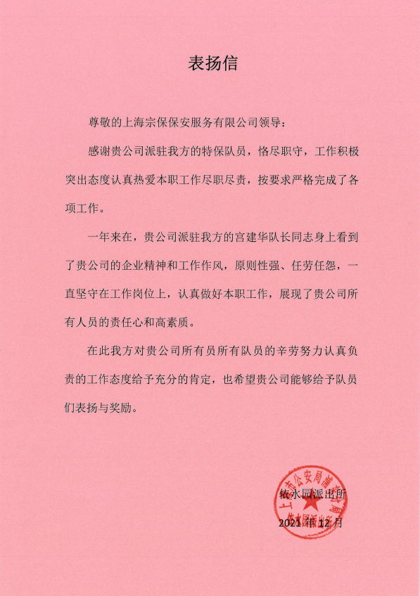 12月24日,宗保公司駐崇明堡鎮(zhèn)項目收到堡鎮(zhèn)城管中隊的表揚信,信中對宗保隊員朱新建盡心履責的工作表現(xiàn)提出特別表揚。