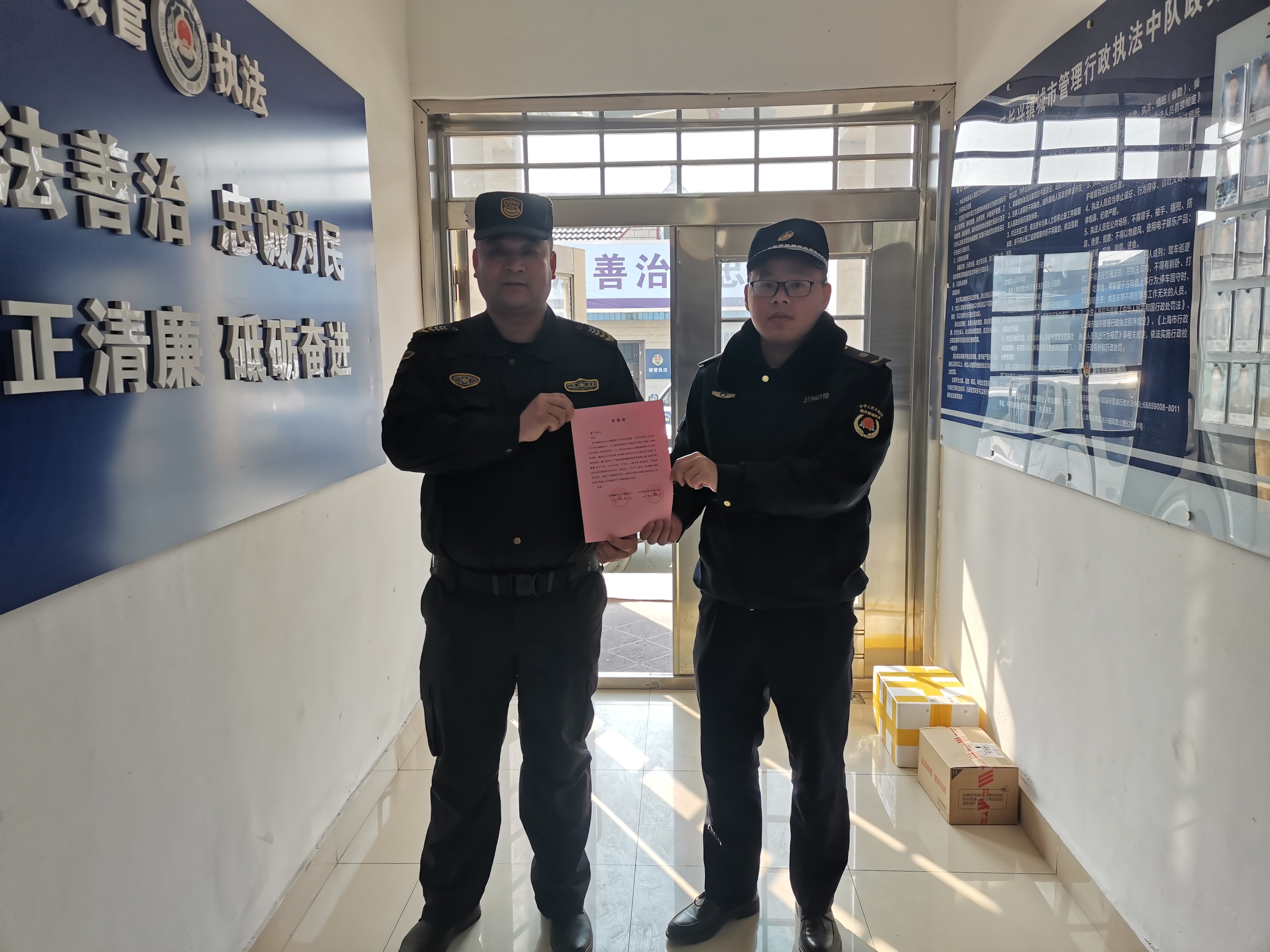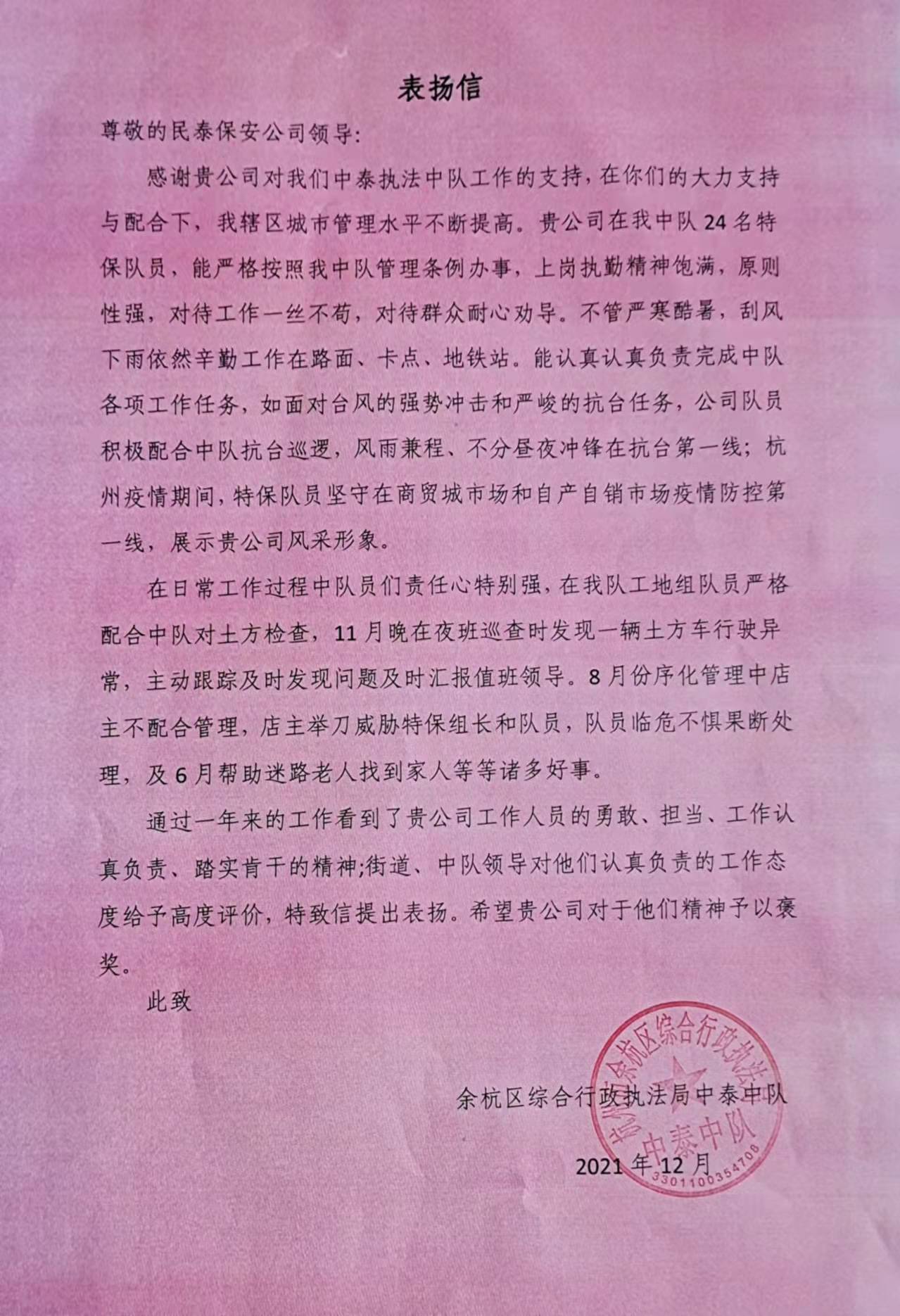 12月29日,浙江民泰駐中泰城管輔助項目收到余杭區(qū)中泰街道城管中隊副中隊長王哲送來的表揚信,信中對民泰隊員履職盡責的工作表現(xiàn)予以表揚。