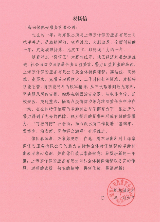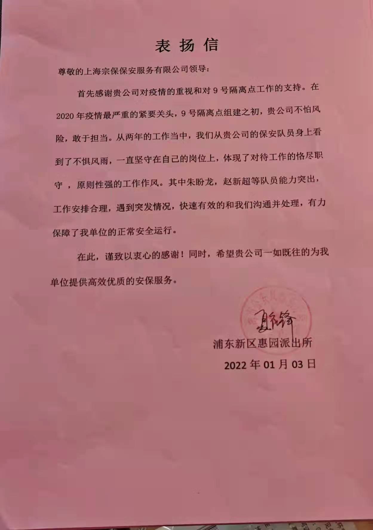 1月3日,宗保公司駐9號(hào)疫情防控隔離點(diǎn)項(xiàng)目收到浦東新區(qū)惠園派出所的表揚(yáng)信,信中表揚(yáng)宗保公司員工突出的工作表現(xiàn),感謝宗保公司對(duì)其工作的大力支持。