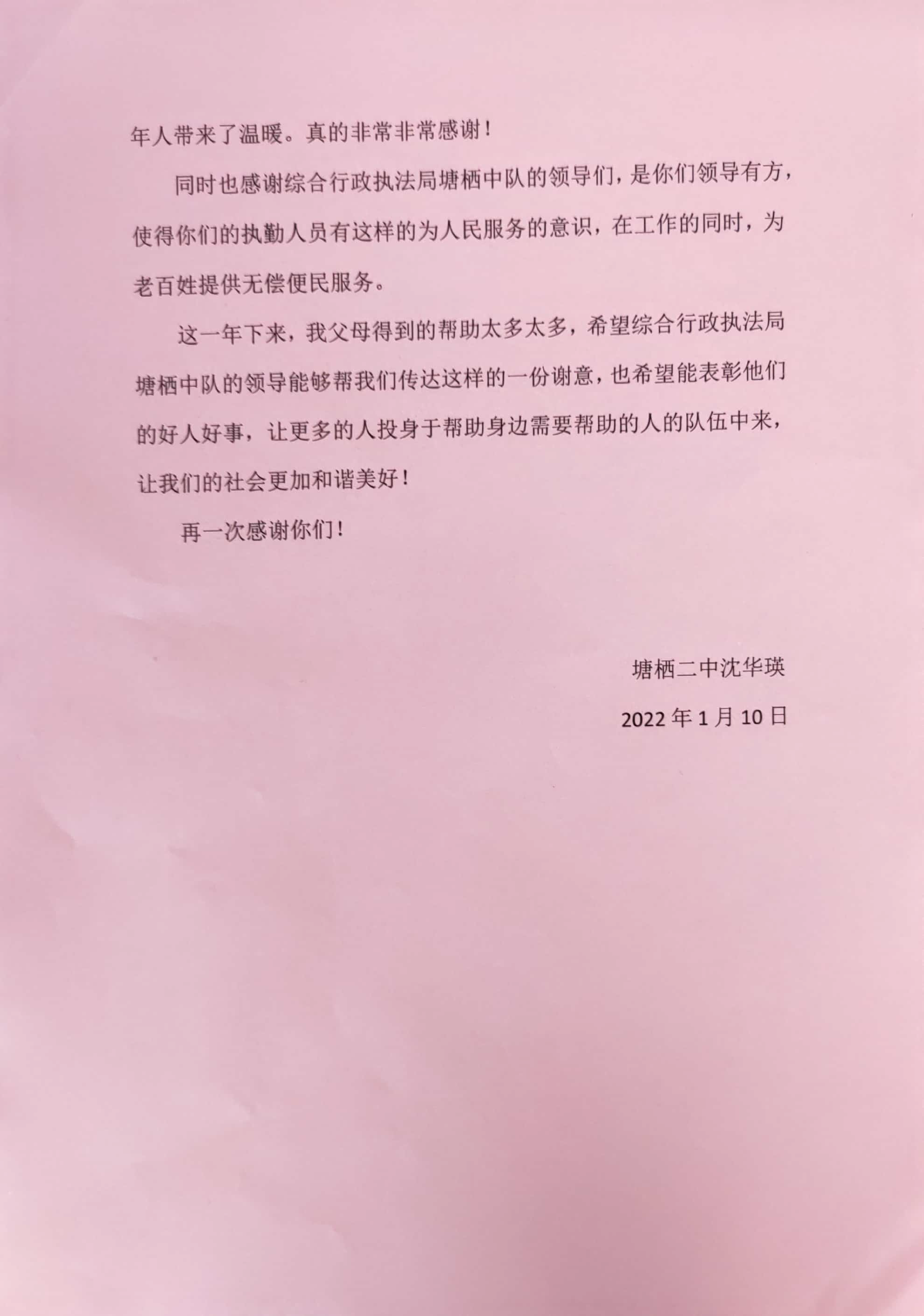 1月10日,浙江民泰駐塘棲市容項(xiàng)目收到塘棲二中沈華瑛老師的感謝信,信中對(duì)民泰隊(duì)員熱心幫助其父母的行為表示感謝。