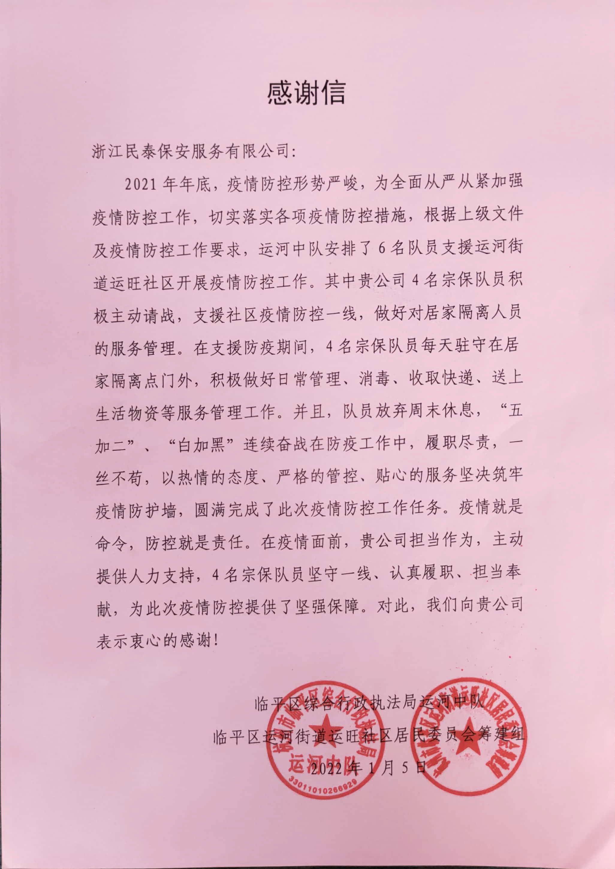 1月11日,浙江民泰駐運(yùn)河市容項(xiàng)目收到臨平區(qū)綜合行政執(zhí)法局運(yùn)河中隊(duì)和運(yùn)河街道運(yùn)旺社區(qū)居民委員會(huì)籌建組送來的感謝信,感謝公司對(duì)社區(qū)疫情防控工作的大力支持。