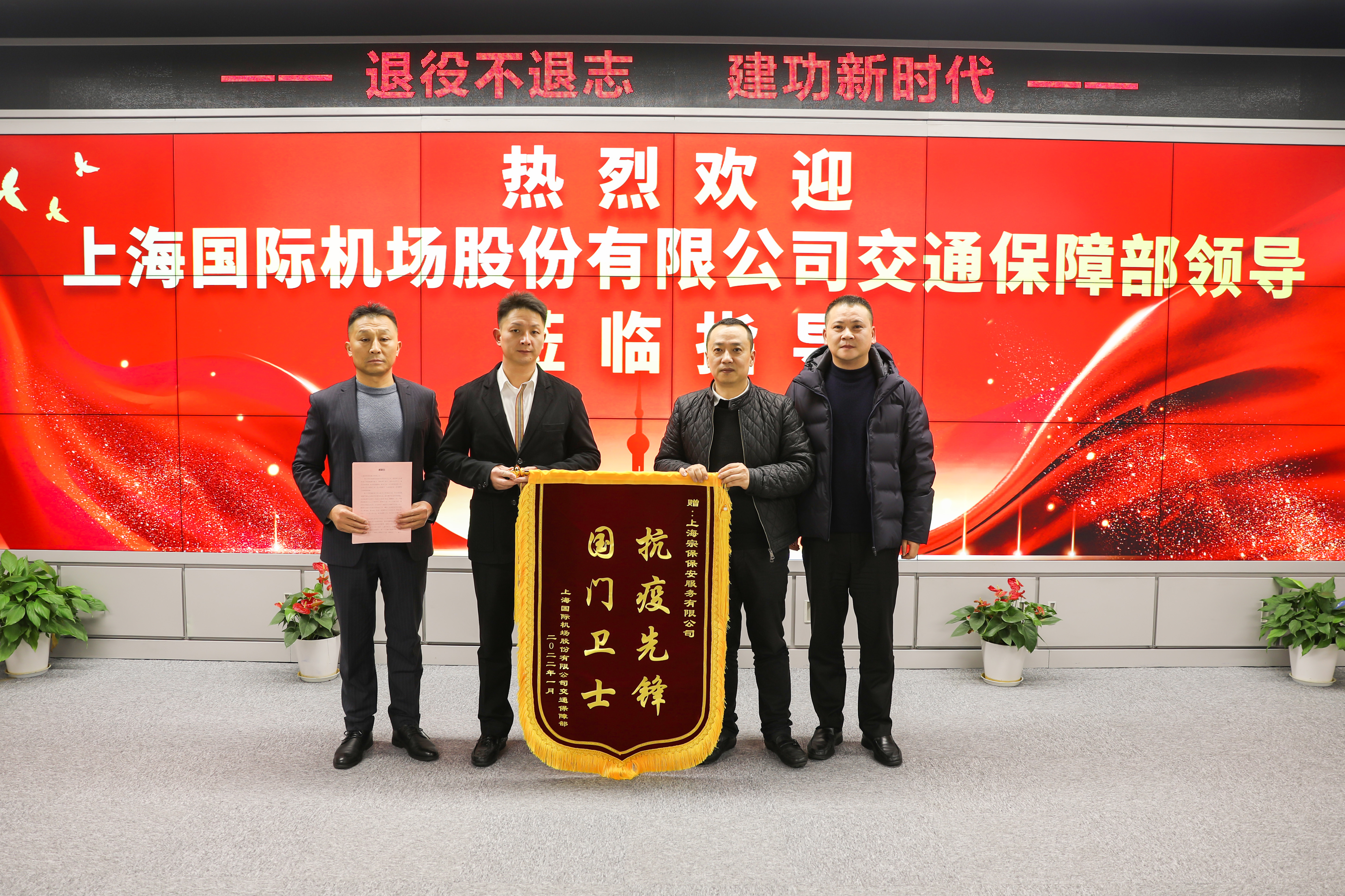 1月25日上午,上海國際機(jī)場股份有限公司安檢護(hù)衛(wèi)保障部黨委書記鮑飛榮、紀(jì)委書記陳長波將一面繡有“防疫一線勇挑重?fù)?dān)當(dāng)尖兵 守護(hù)空港忠誠履職保平安”的錦旗送到宗保公司,感謝公司對浦東機(jī)場防疫工作的大力支持和突出表現(xiàn)。