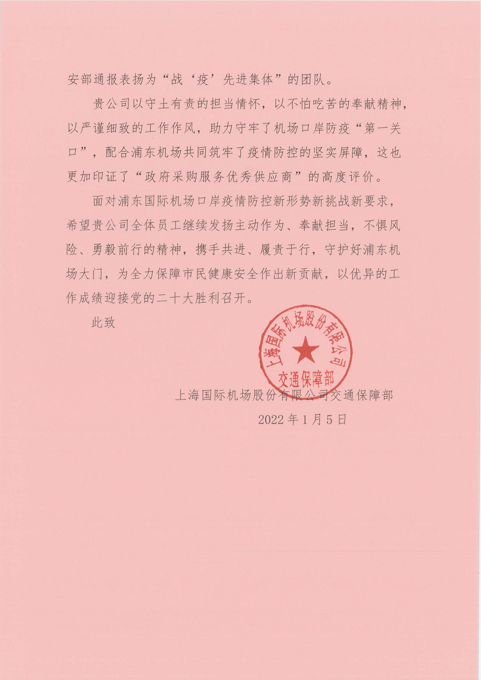 —上海國際機(jī)場股份有限公司交通保障部送來錦旗和感謝信