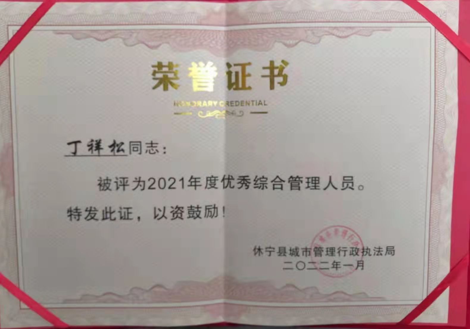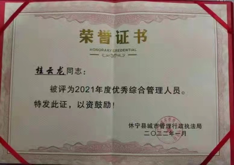 1月26日上午,休寧縣城市管理行政執(zhí)法局召開2021年度工作總結(jié)表彰部署會(huì)議,會(huì)上,公司駐休寧市容項(xiàng)目隊(duì)員桂云龍、丁祥松被評(píng)為2021年度優(yōu)秀綜合管理人員。